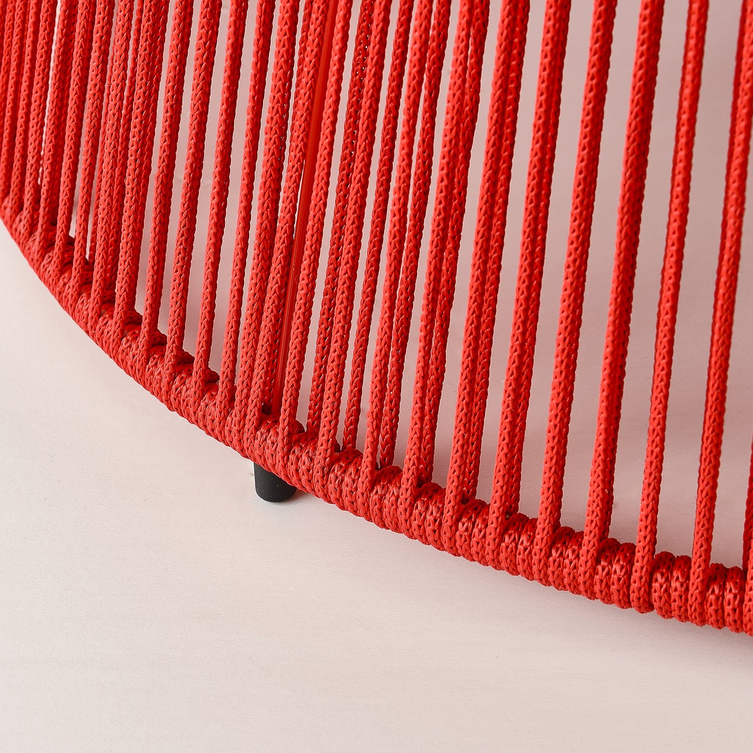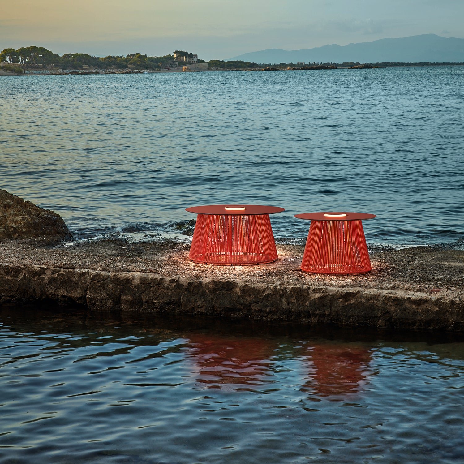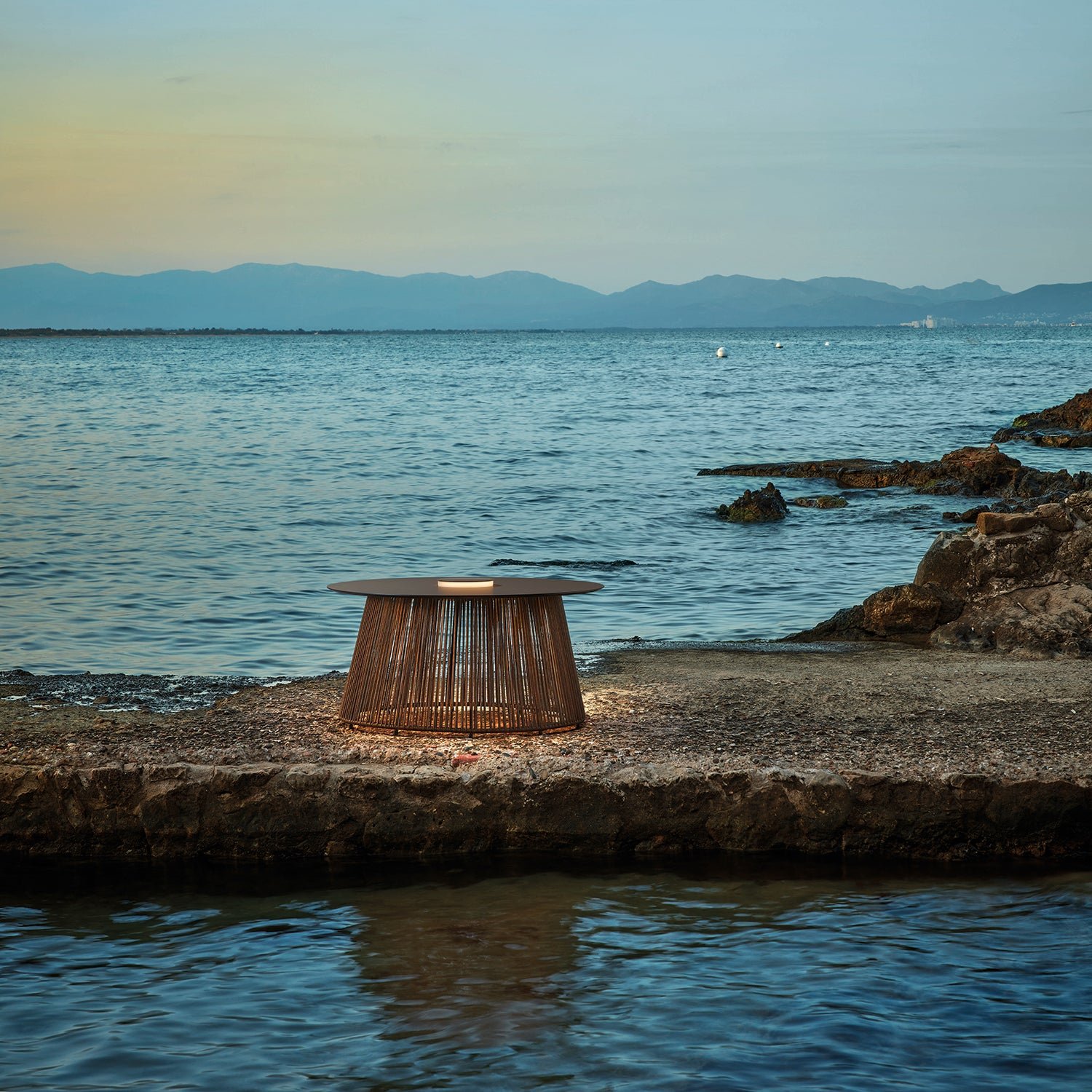 A circular surface appears to float above an illuminated base, seamlessly integrating light without taking up usable space, and casting a soft glow around it. This battery-powered lamp emits light both upwards and downwards. The upper light subtly emerges, casting a gentle glow over the tabletop to reveal objects in the dark. The light source is encased within the metal structure, indirectly illuminating the hand-woven screen made from nautical cord or synthetic rattan.