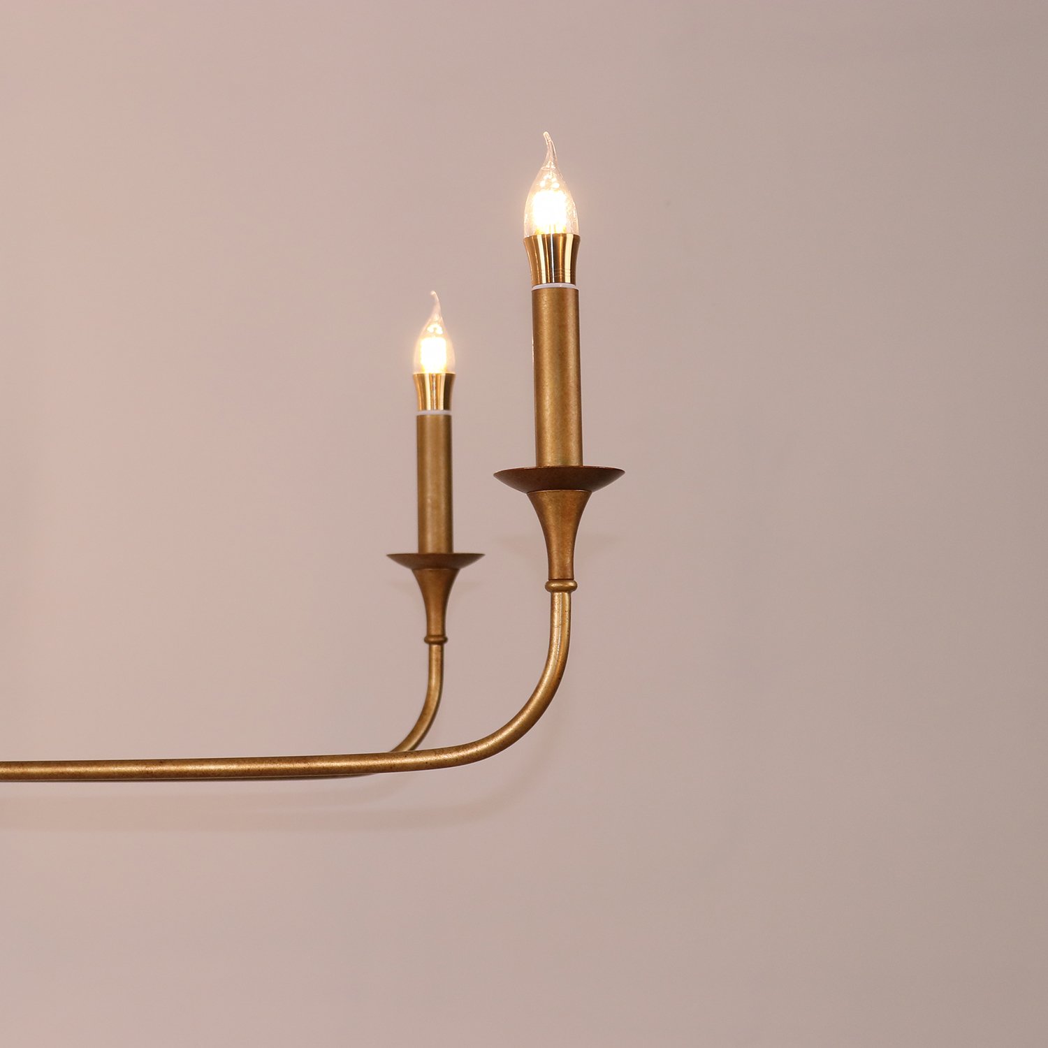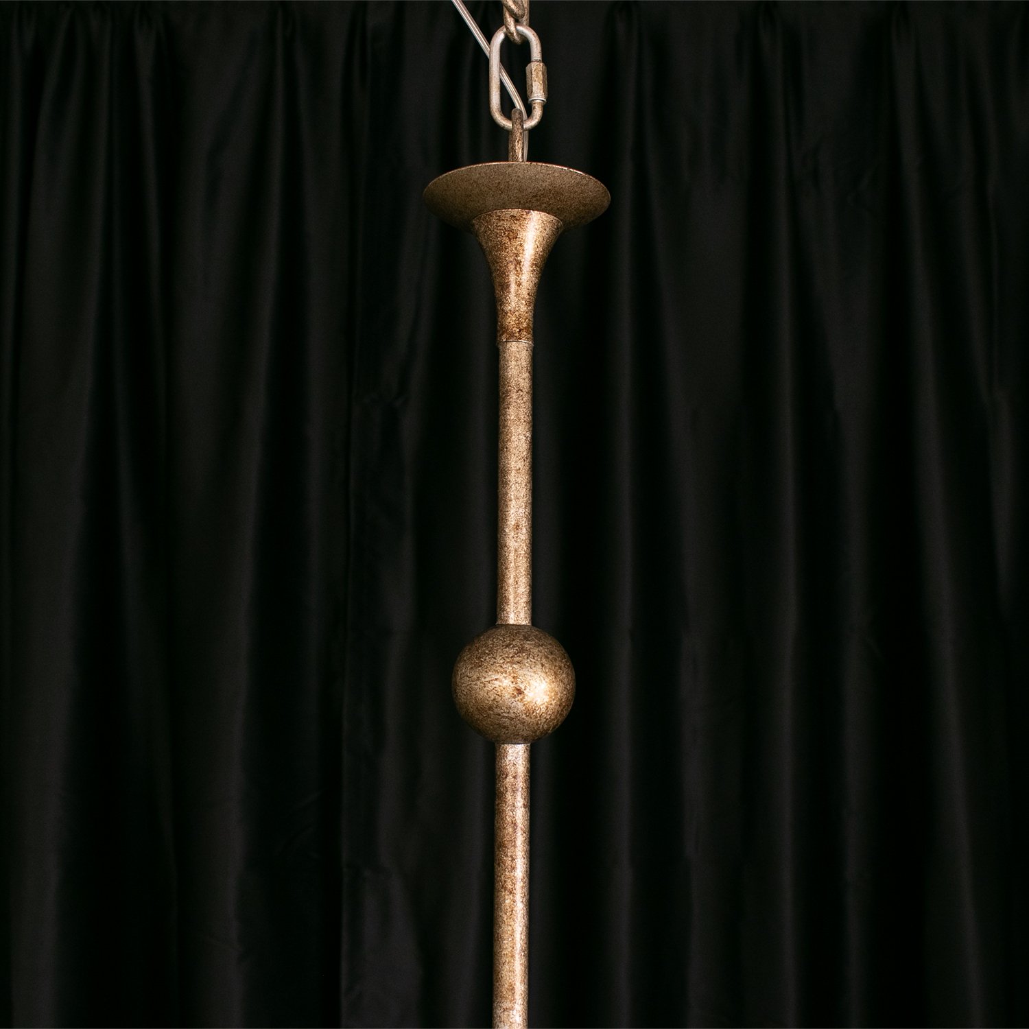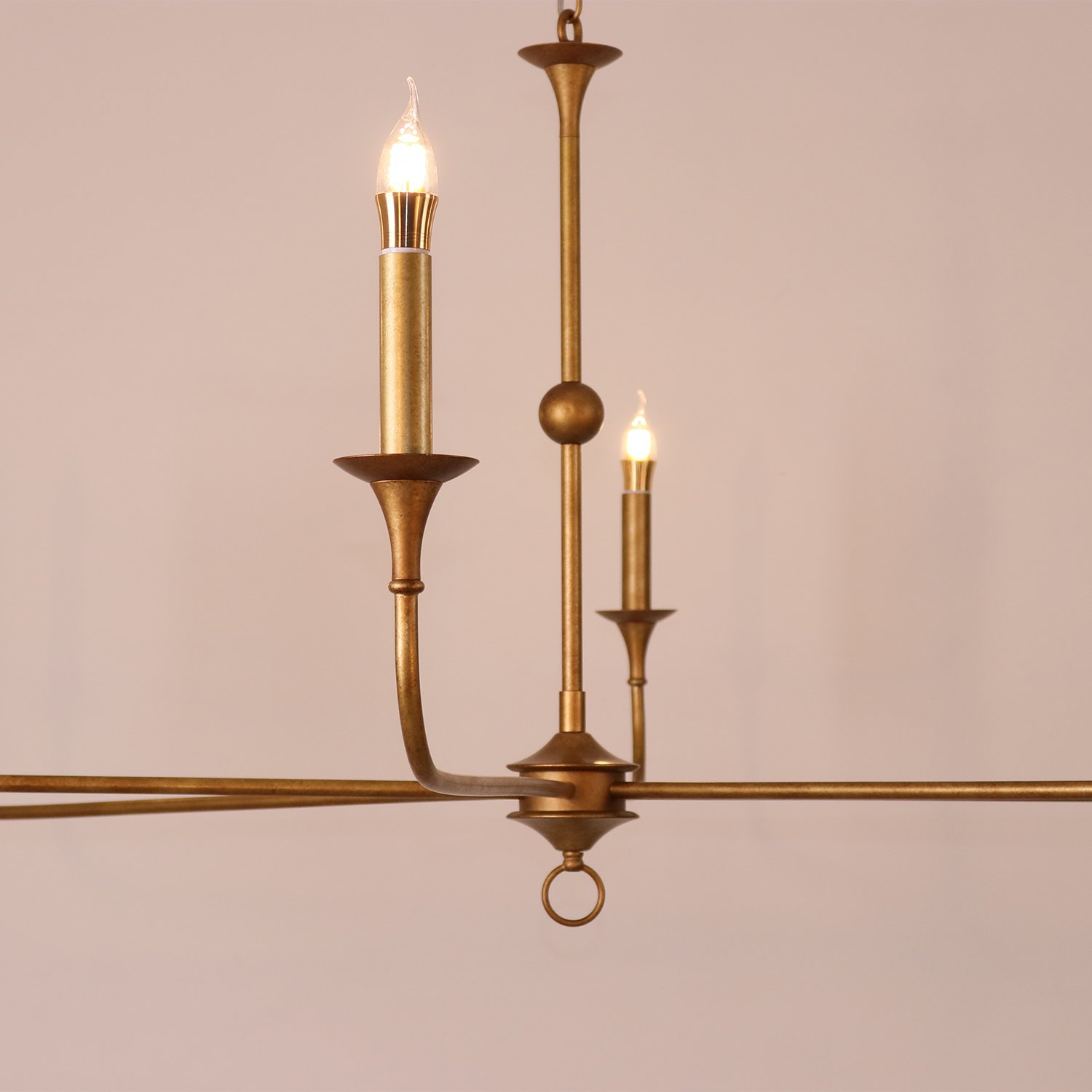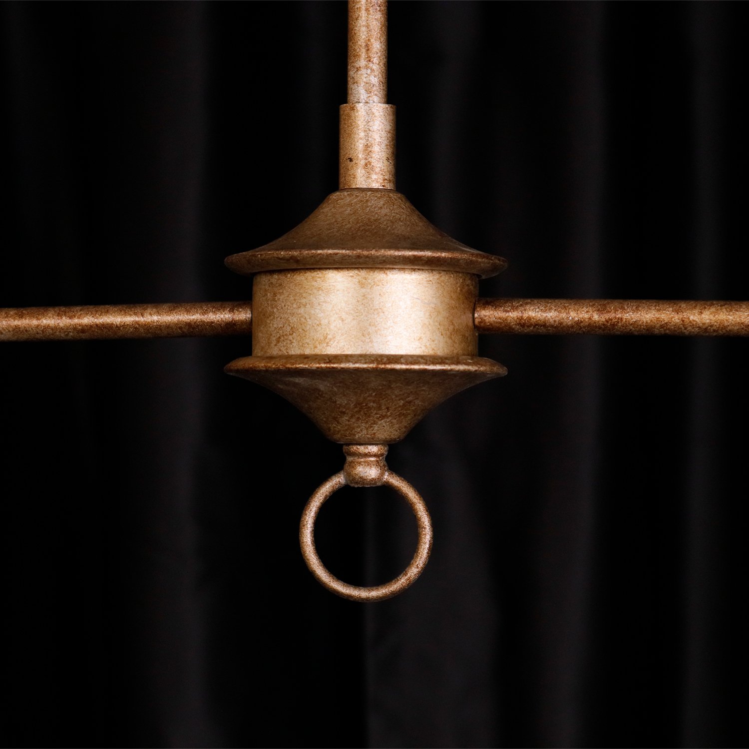 The linear bronze pendant light showcases a sophisticated design with long, graceful arms extending from small gears, complemented by a decorative ring at its base. The fixture exudes a sense of fluidity, while the pyrite bronze finish adds a rich texture to the overall appearance. Suspended from a sleek rod instead of a traditional chain, this design offers a contemporary twist while still retaining its classic charm. Its streamlined shape makes it an ideal choice for hanging above kitchen islands or bar areas.