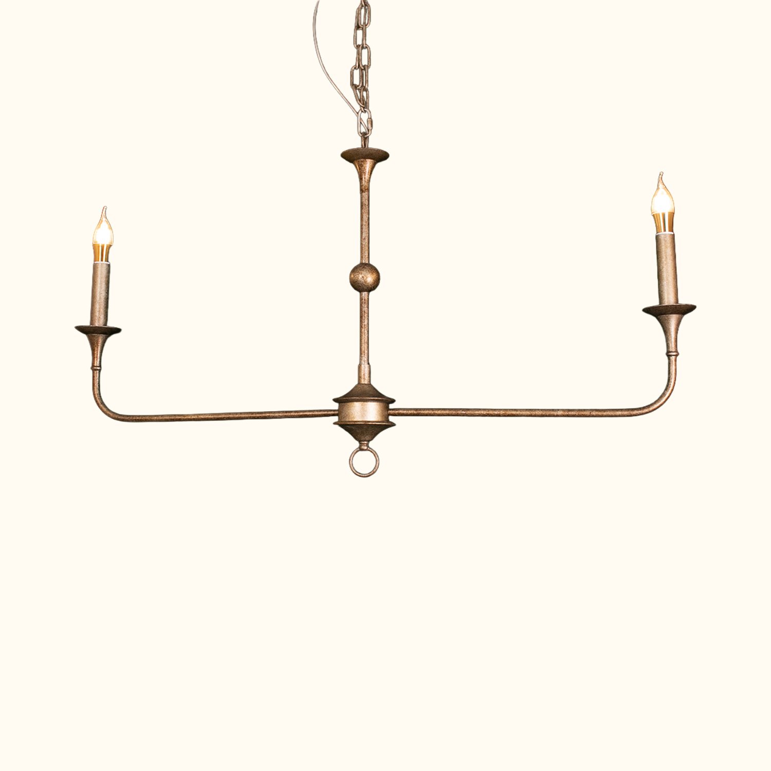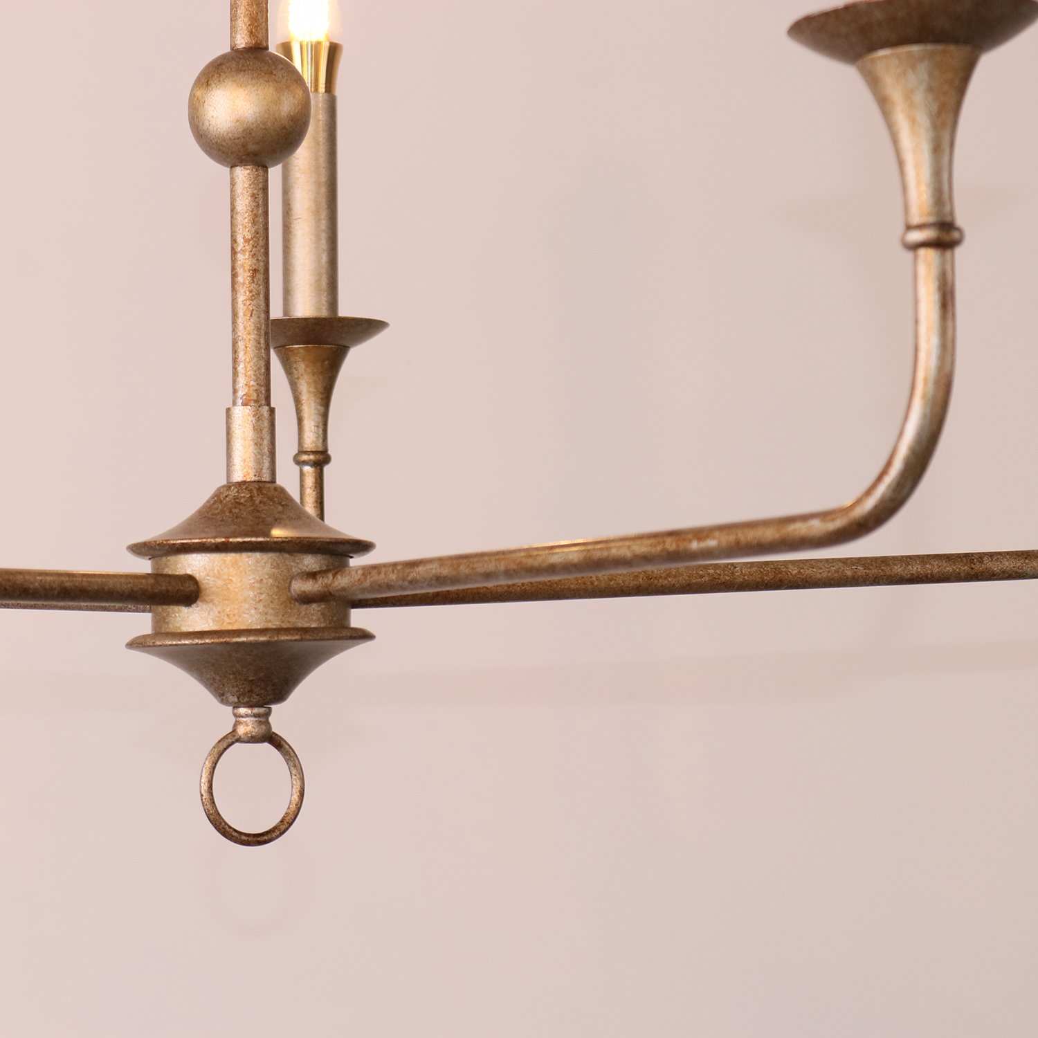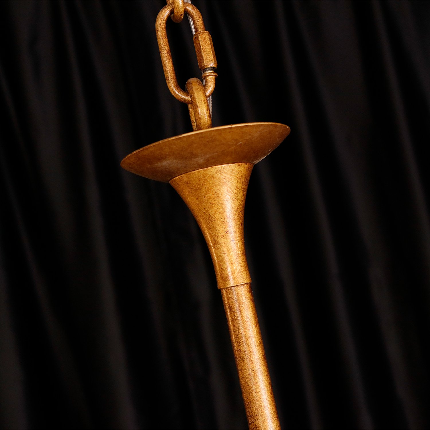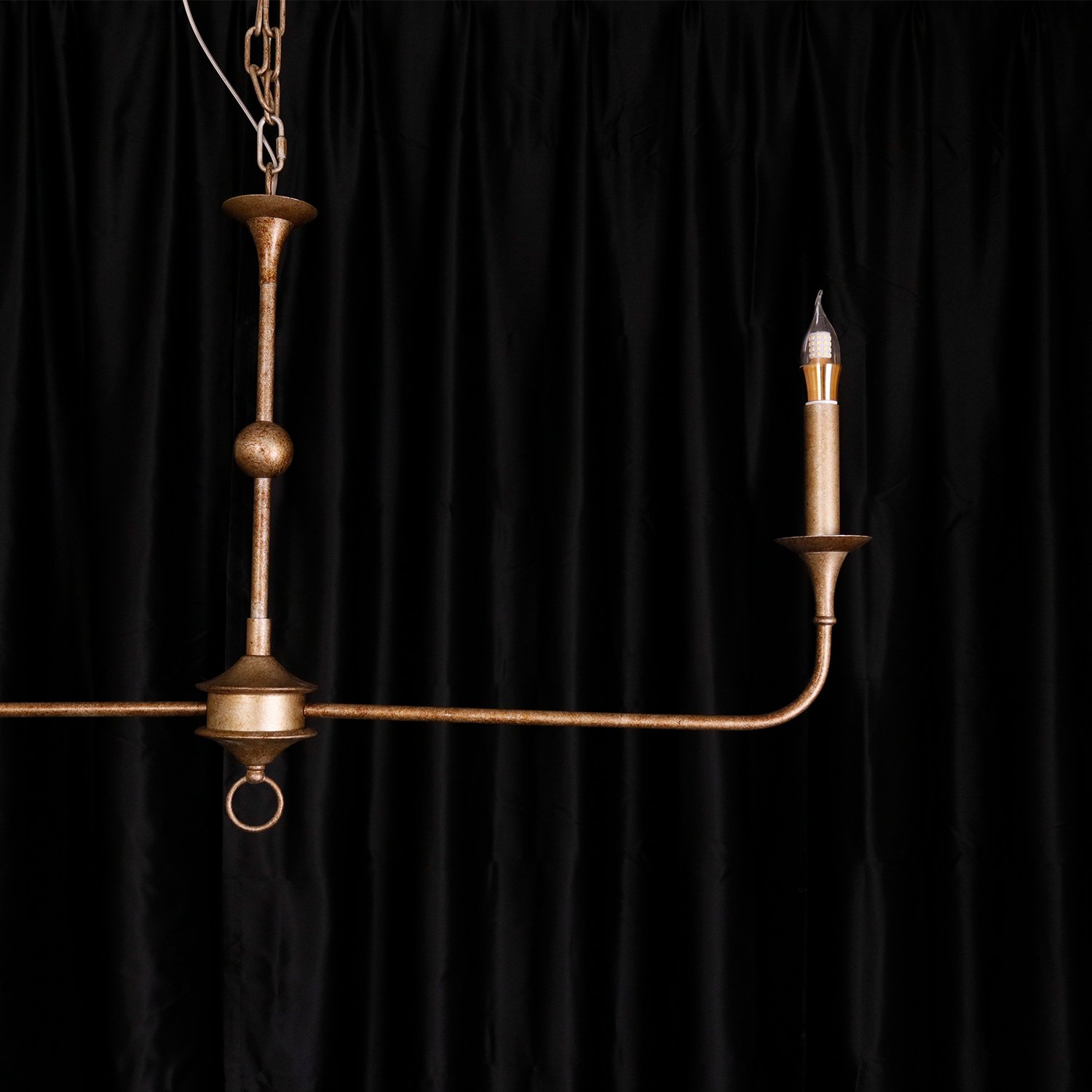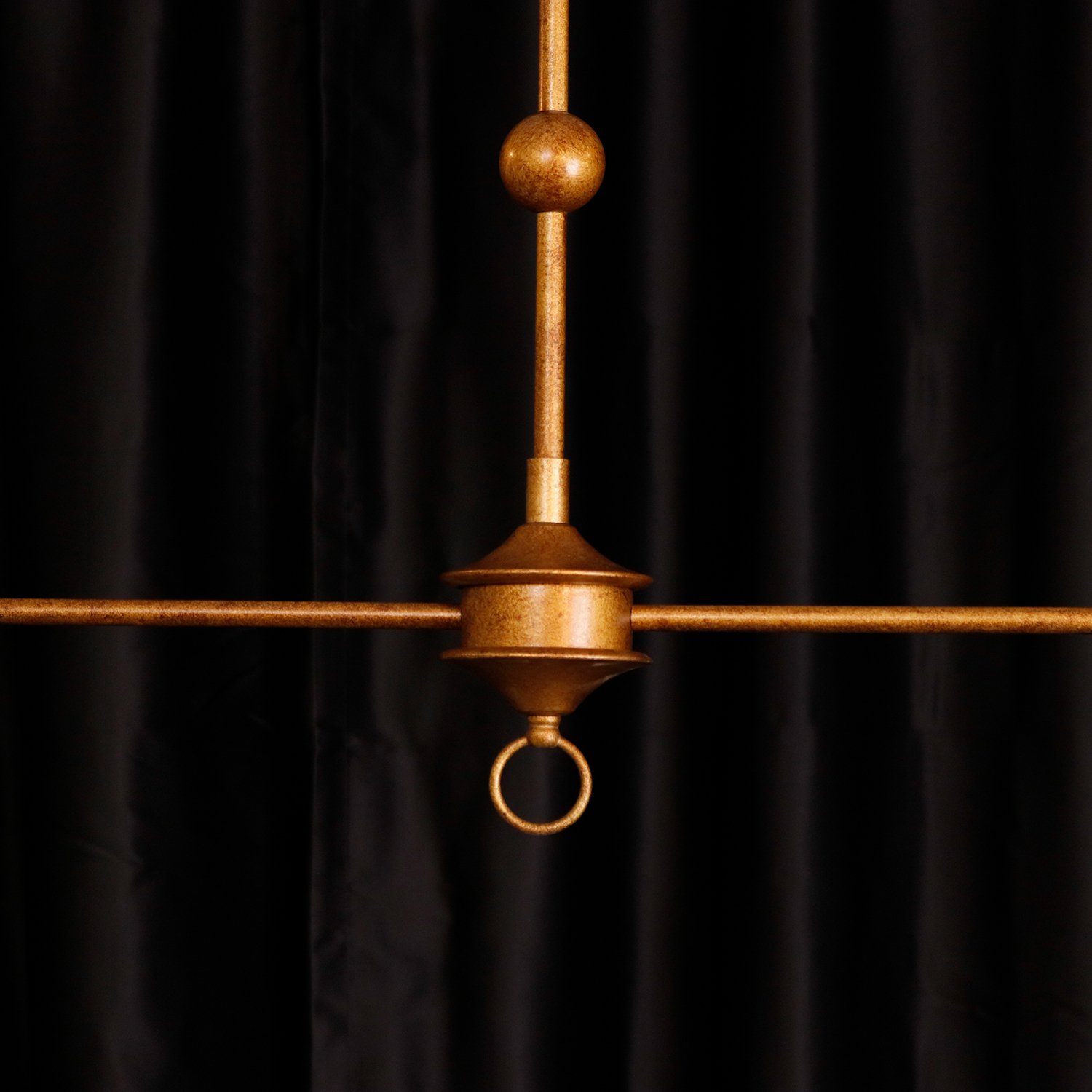 The linear bronze pendant light showcases a sophisticated design with long, graceful arms extending from small gears, complemented by a decorative ring at its base. The fixture exudes a sense of fluidity, while the pyrite bronze finish adds a rich texture to the overall appearance. Suspended from a sleek rod instead of a traditional chain, this design offers a contemporary twist while still retaining its classic charm. Its streamlined shape makes it an ideal choice for hanging above kitchen islands or bar areas.