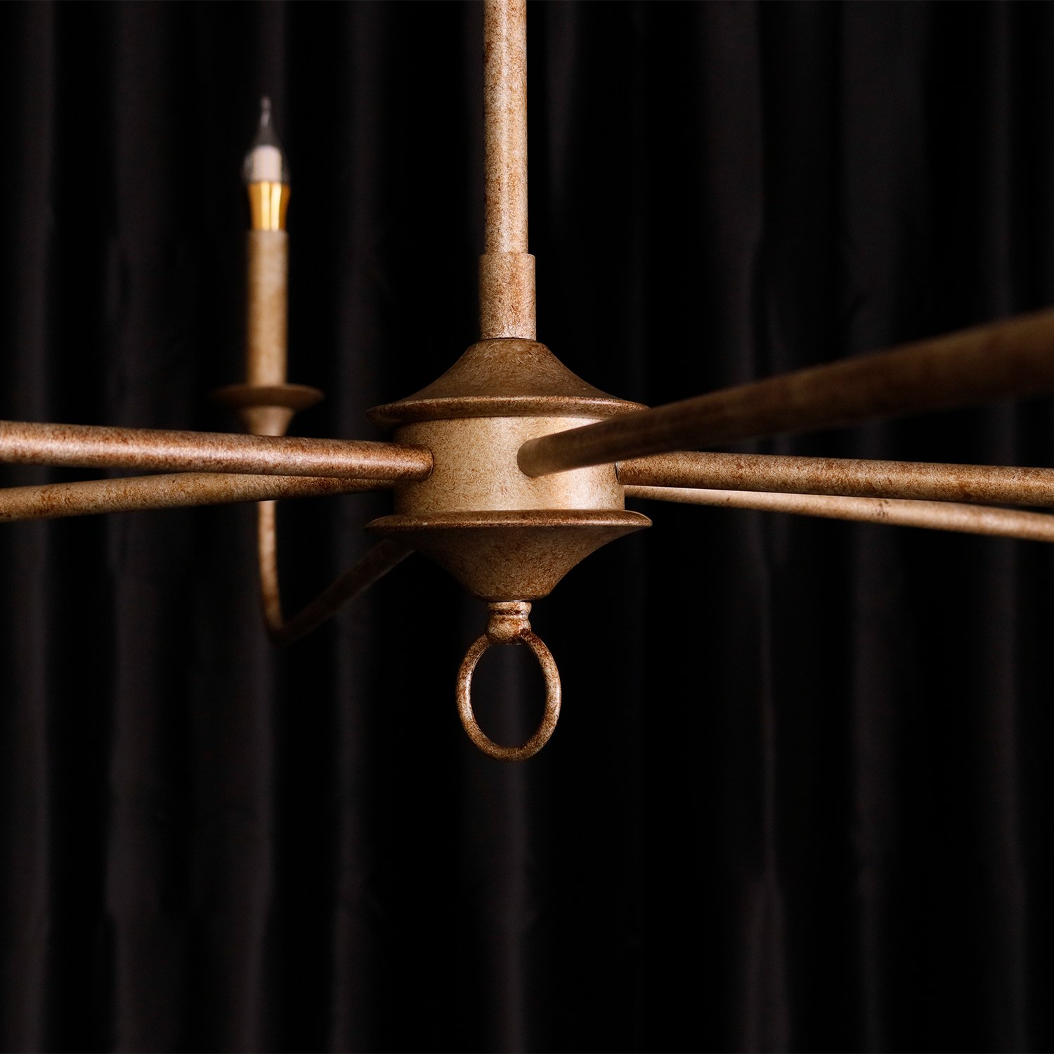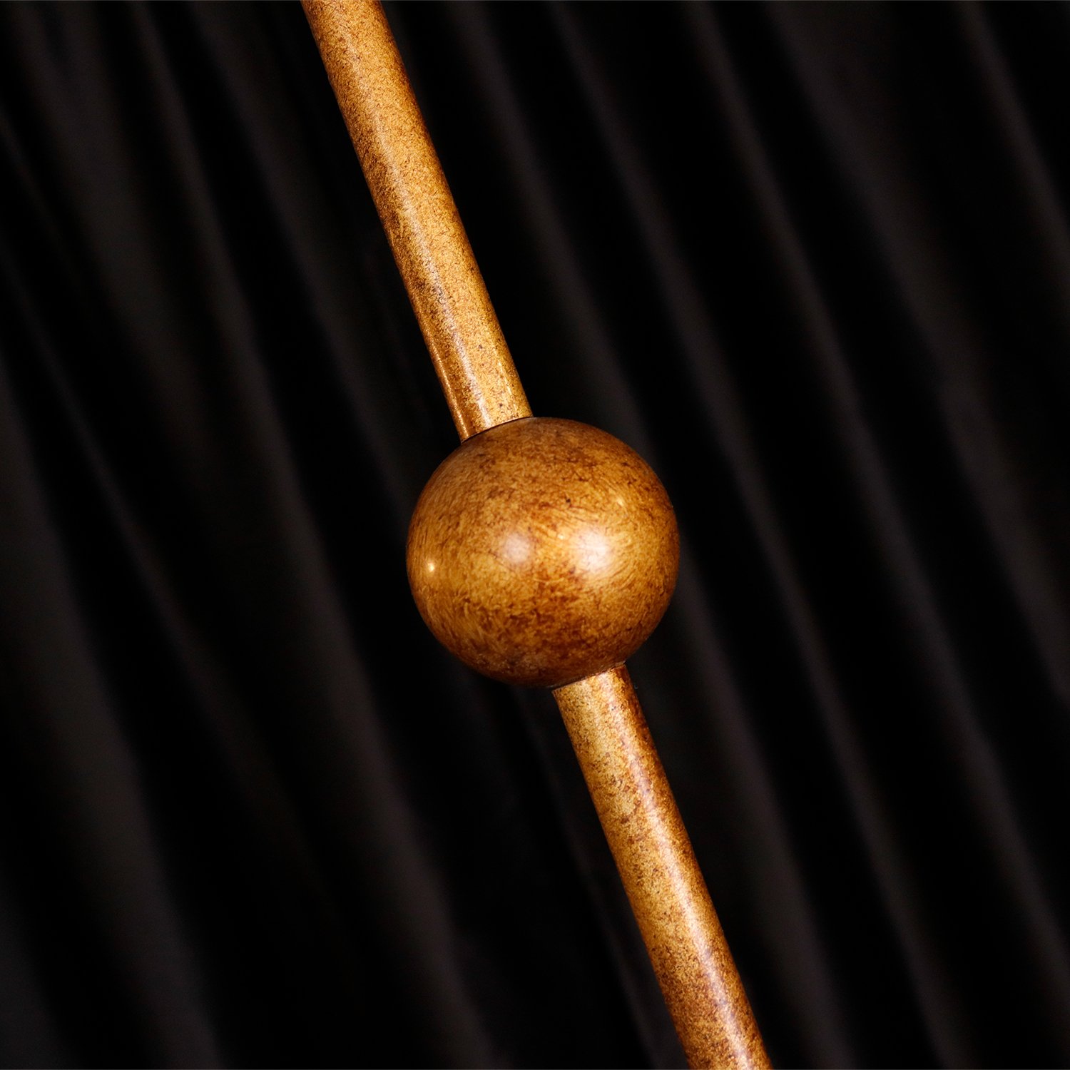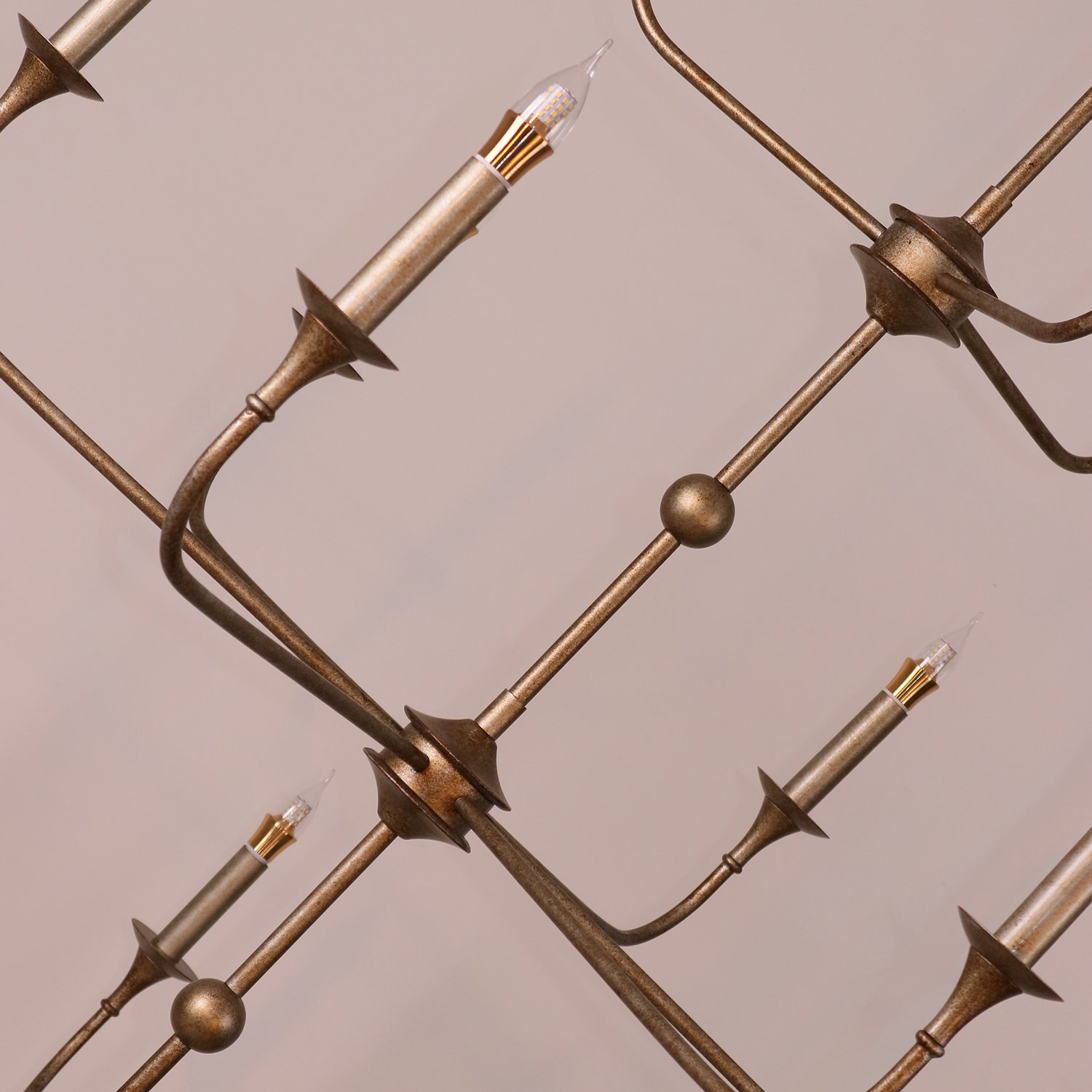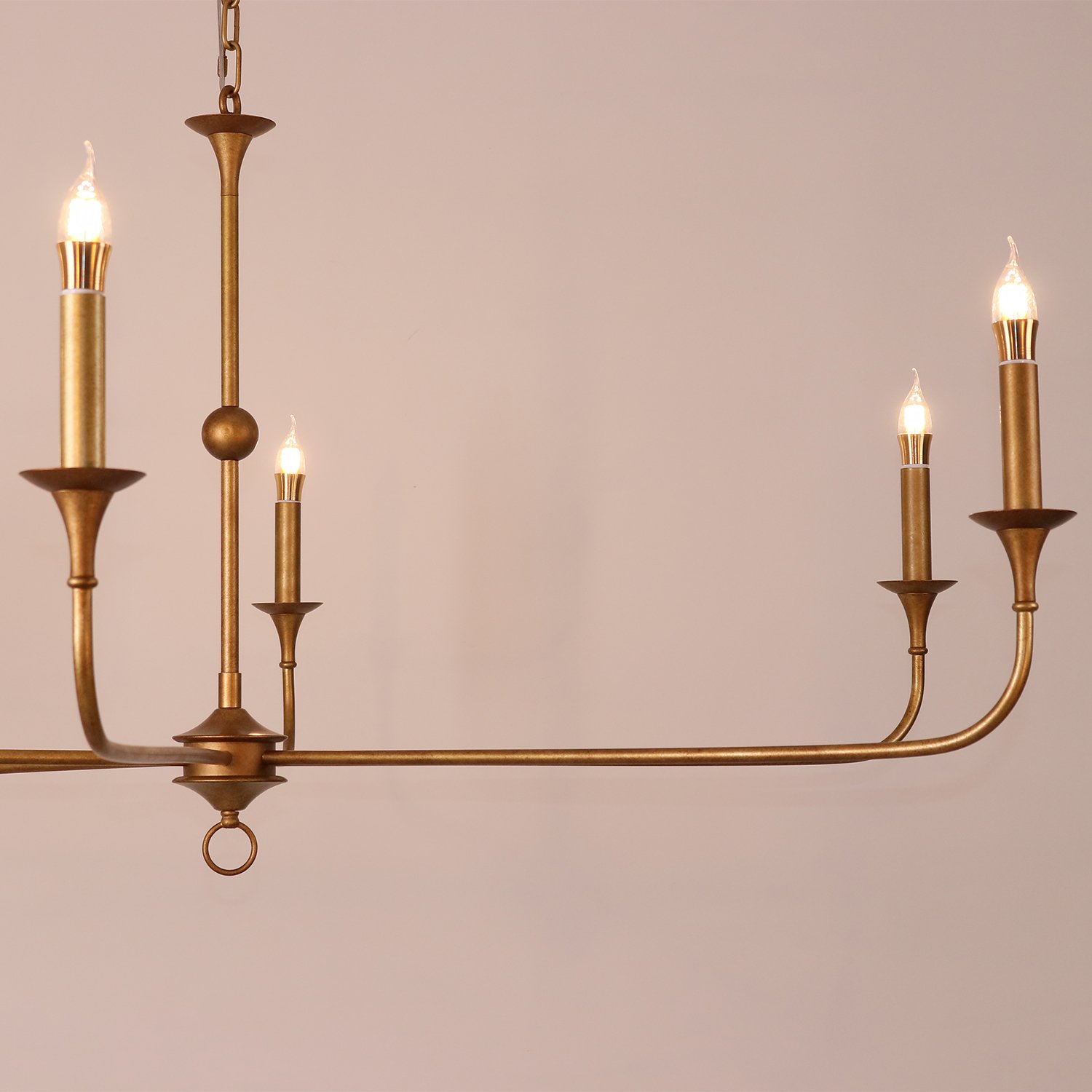The linear bronze pendant light showcases a sophisticated design with long, graceful arms extending from small gears, complemented by a decorative ring at its base. The fixture exudes a sense of fluidity, while the pyrite bronze finish adds a rich texture to the overall appearance. Suspended from a sleek rod instead of a traditional chain, this design offers a contemporary twist while still retaining its classic charm. Its streamlined shape makes it an ideal choice for hanging above kitchen islands or bar areas.