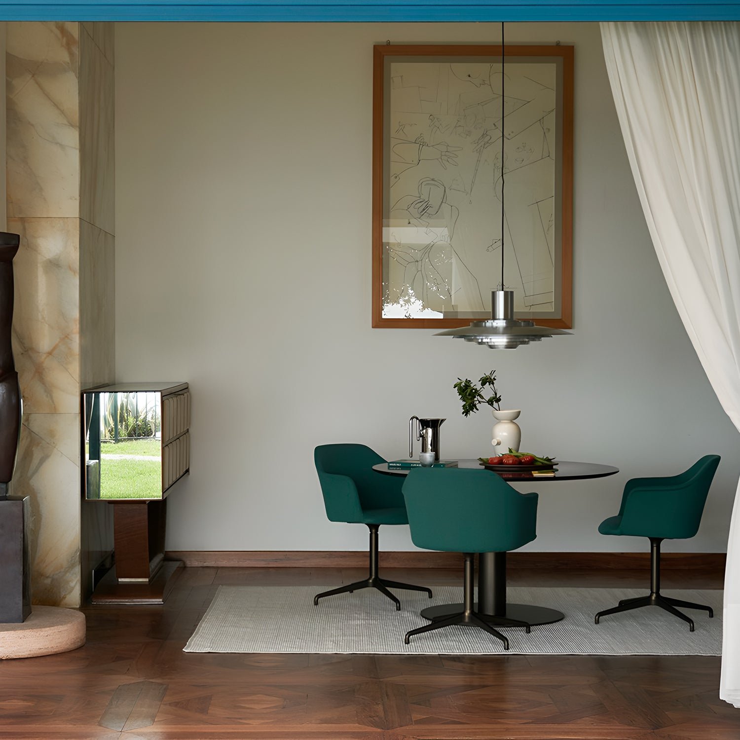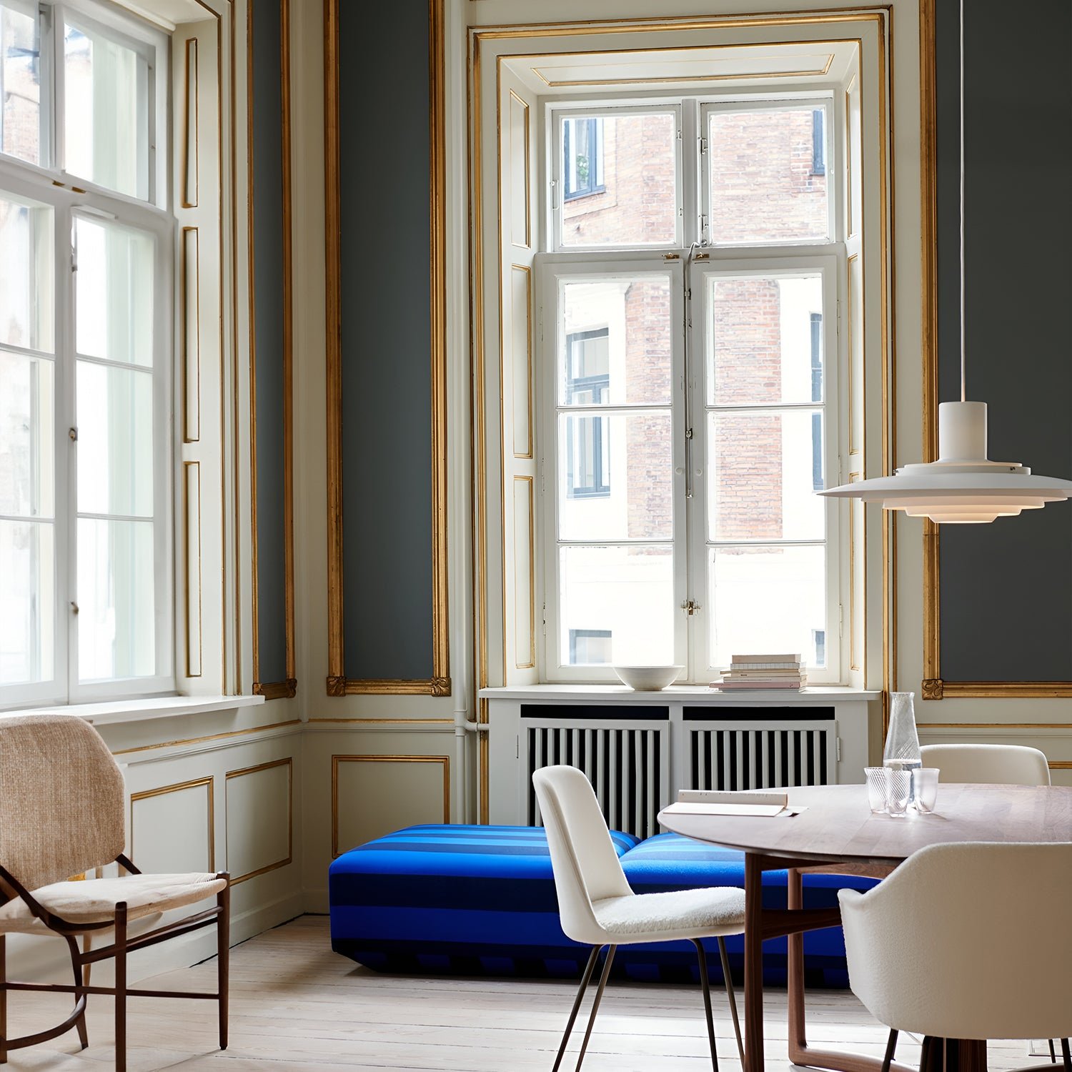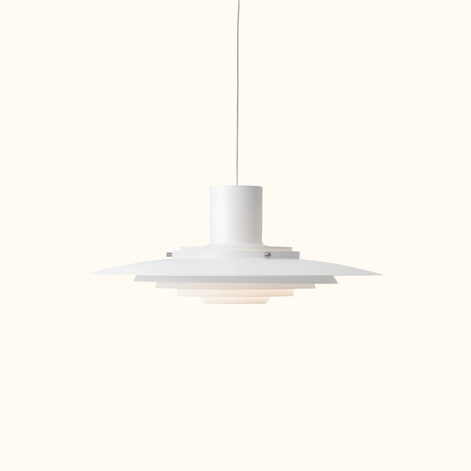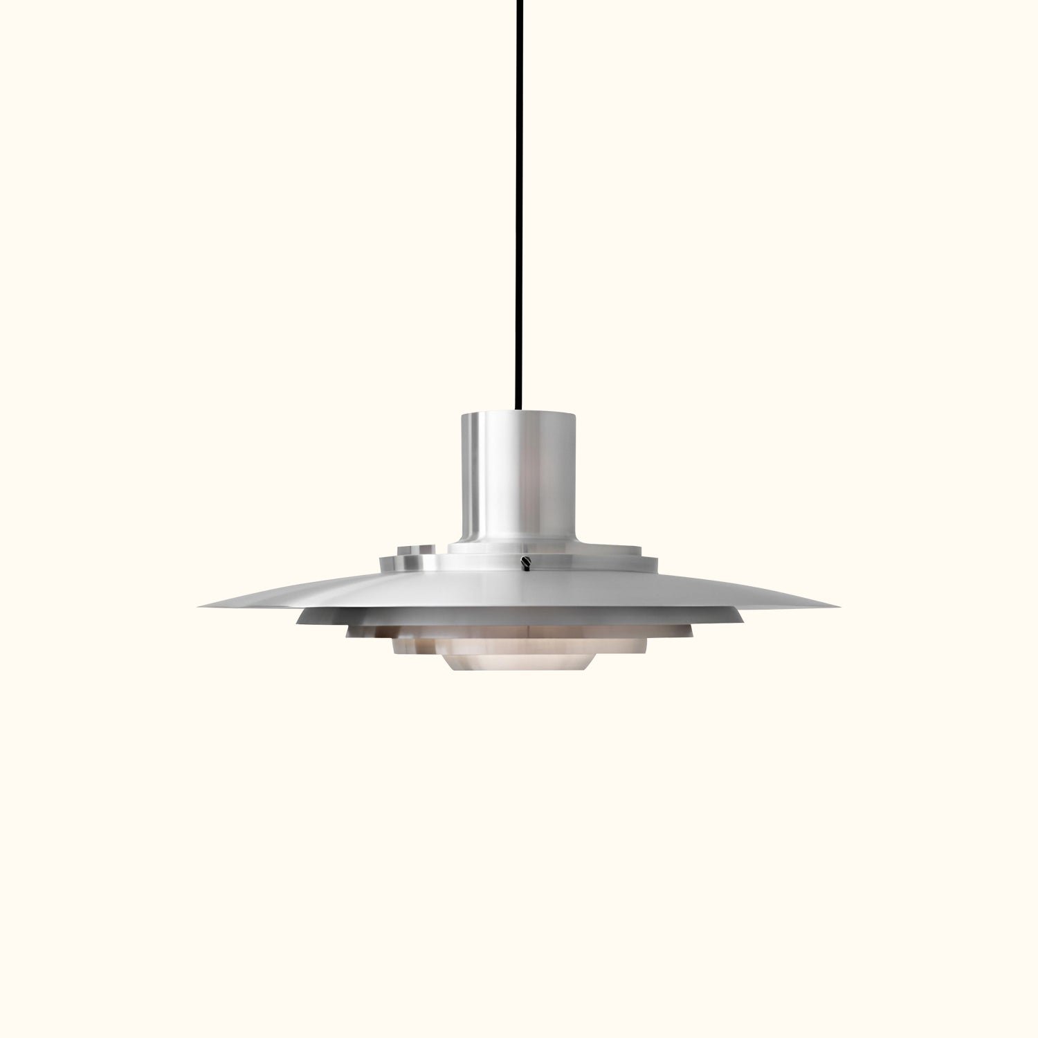 Two architects with a shared mission sought to make form a pure expression of function. Both graduates of the Danish School of Interior Design, they studied under prominent design masters. The pendant lamp is a perfect example of their subtle architectural approach to design. Originally created in 1963, the lamp features five concentric shades that gradually curve towards the center, emitting a soft and diffused light. The precise arrangement of the shades, combined with the sleek aluminum finish, creates a timeless and captivating expression.