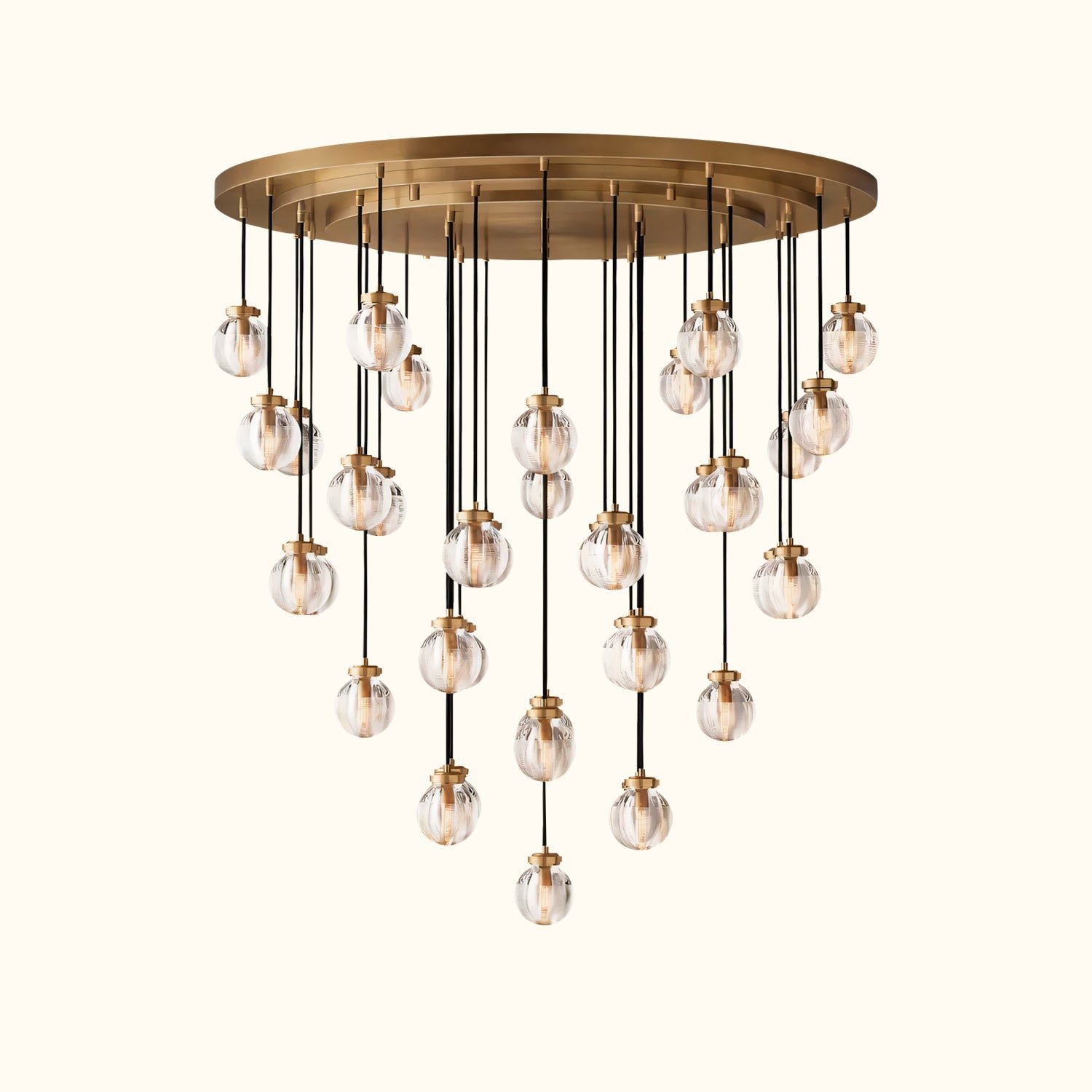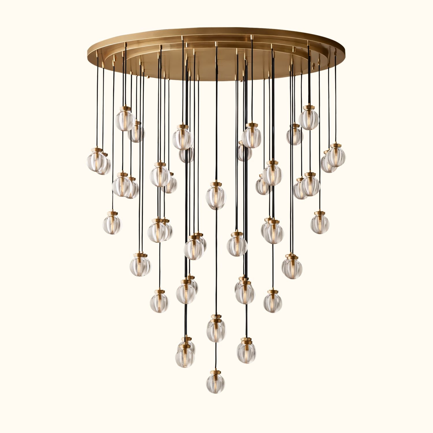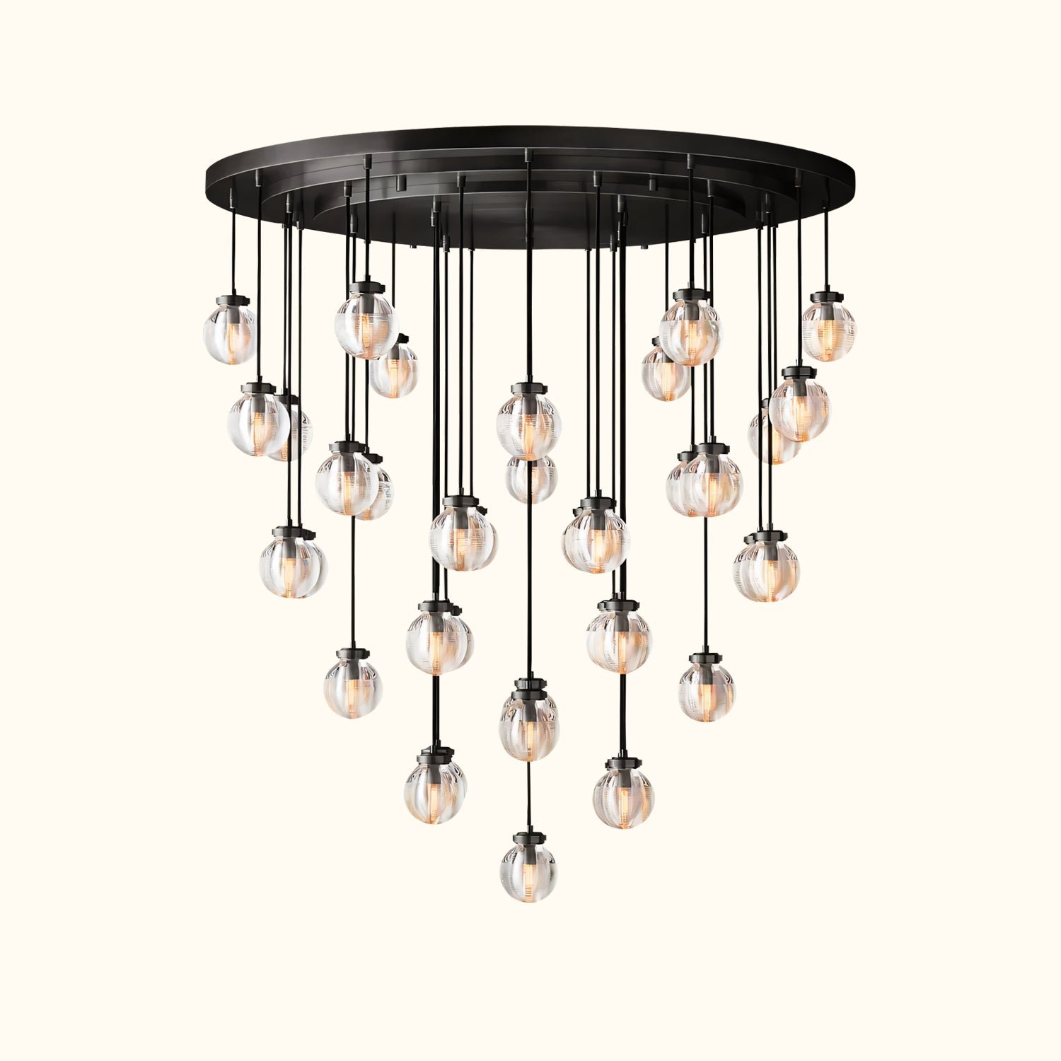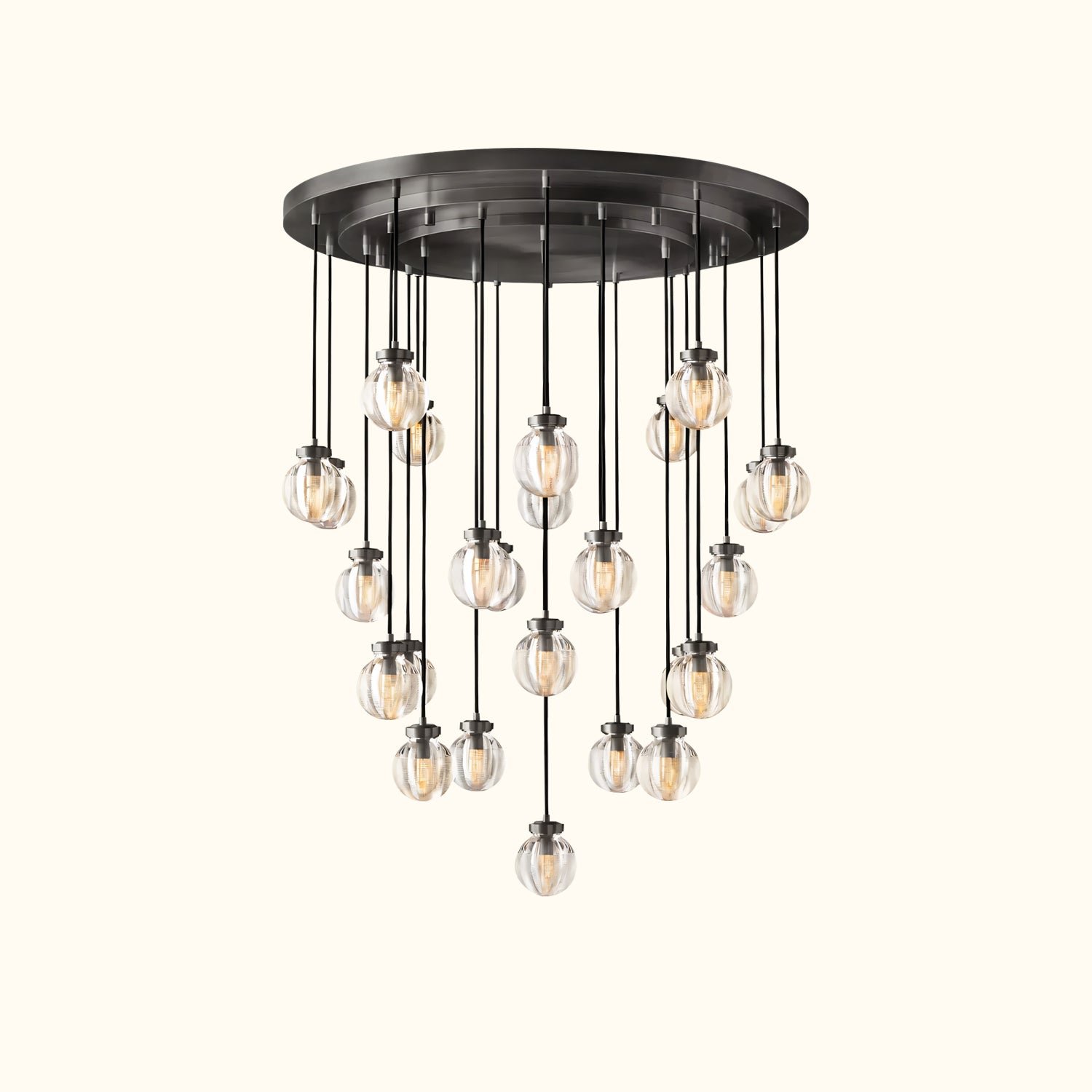 Glass pearls are carved with intricate grooves that create shimmering layers of light, bringing a lustrous, oceanic beauty to this collection. Influenced by the inciso technique developed by Venetian glass makers, the texture both filters the illumination and invites contemplation, making these pieces feel simultaneously ethereal and intimate.
