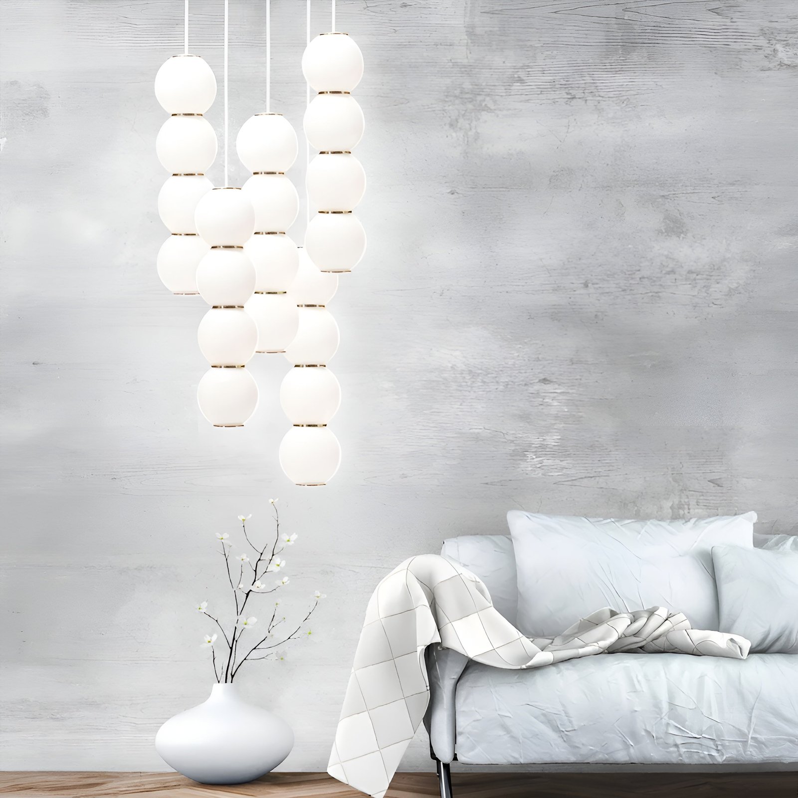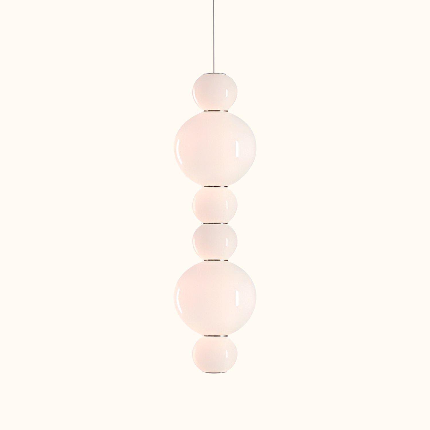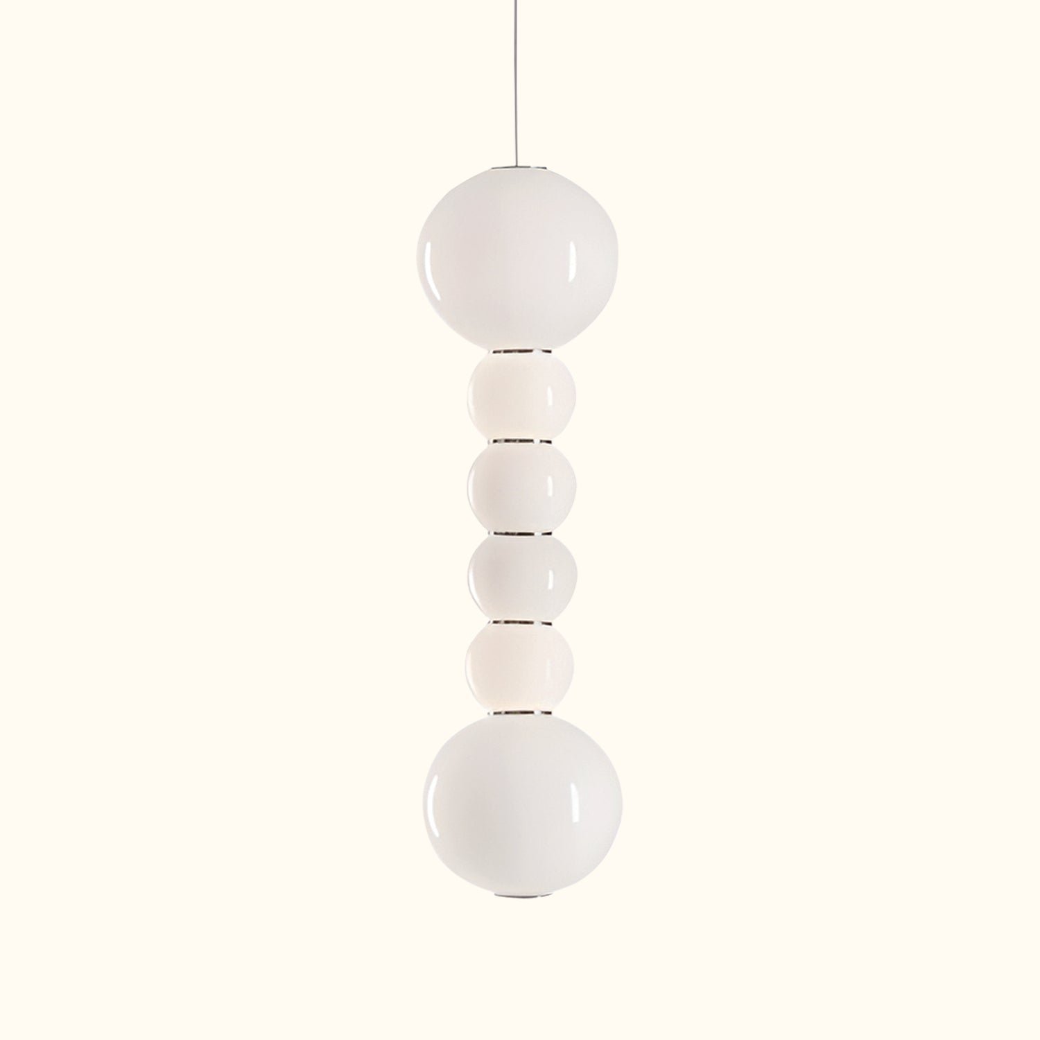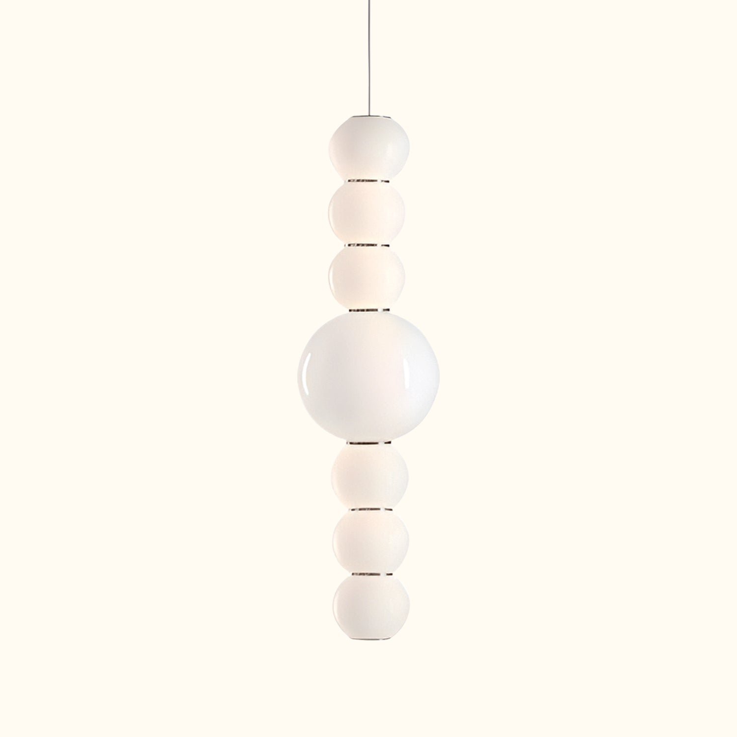 The PEARLS chandelier is timeless, elegant, and offers countless possibilities. By combining two different sizes of opal glass spheres, various arrangements and shapes can be achieved. If multiple versions of PEARLS are placed in a room, the decor will always remain consistent, neither excessive nor boring. PEARLS can be arranged in any grouping as desired, providing perfect lighting for living rooms, above bars, staircases, or atriums. It is absolutely eye-catching.