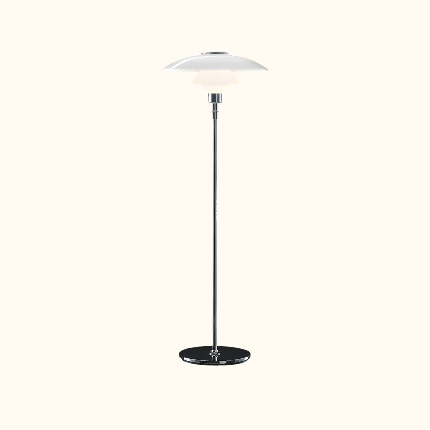 The fixture is designed based on the principle of a reflective three-shade system, which directs most of the light downwards. The shades are made of hand-blown opal three-layer glass, with a glossy finish on the top and a sandblasted matte finish on the underside, resulting in a soft and uniform light distribution.
