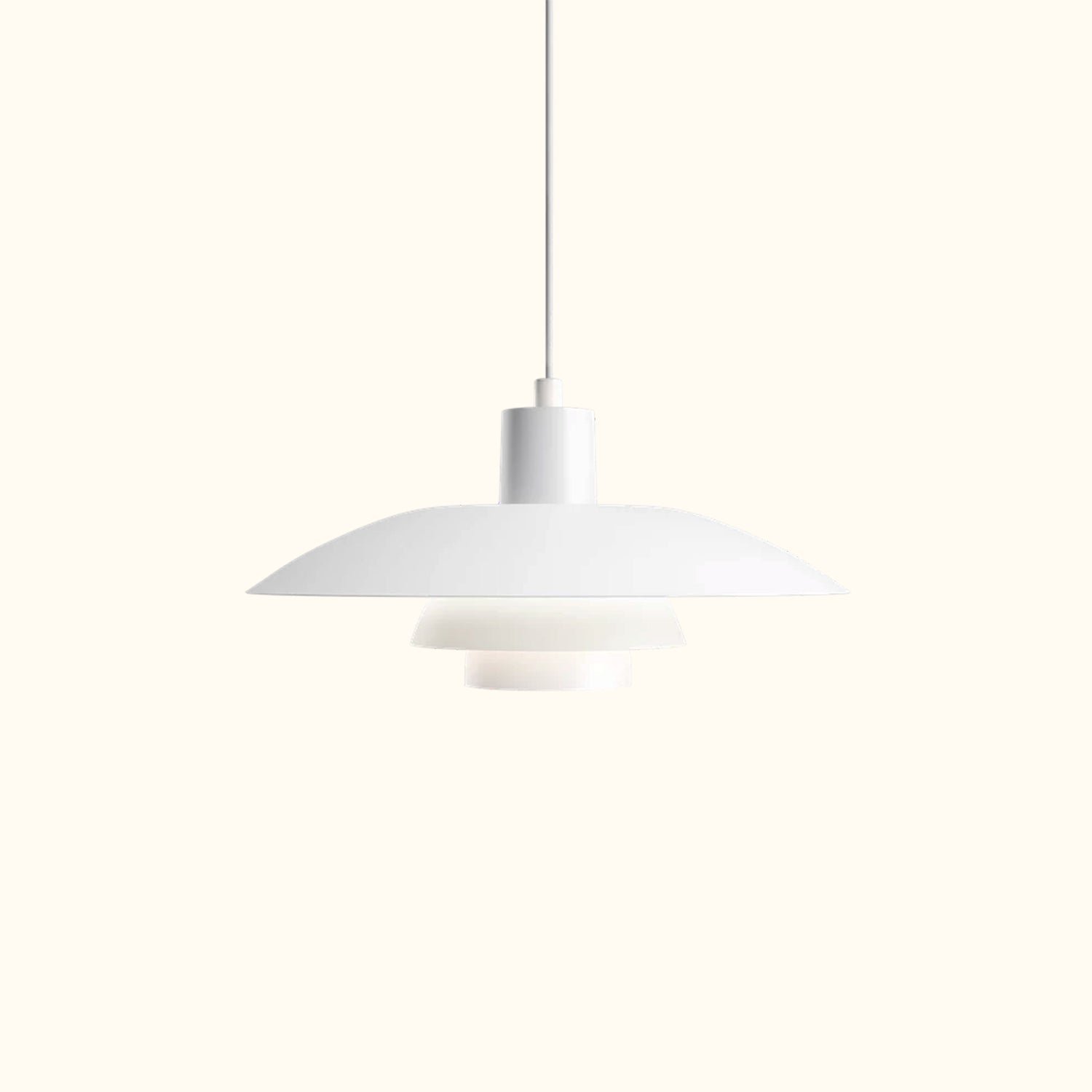 The PH 4/3 metal pendant lamp was launched in 1966. Its design follows the common three-shade system based on a logarithmic spiral, with the light source positioned at the center of the spiral. This lamp is a simplified version of a design created by Poul Henningsen in 1929, which earned him the highest honor at the Barcelona World Exposition at that time. The metal pendant lamp is available in multiple sizes and colors, with the underside of the shade painted white to provide diffused light. To create a warm lighting atmosphere, a version with a gold-plated underside was also introduced. Over the years, the metal pendant lamp has been released in various sizes and colors.