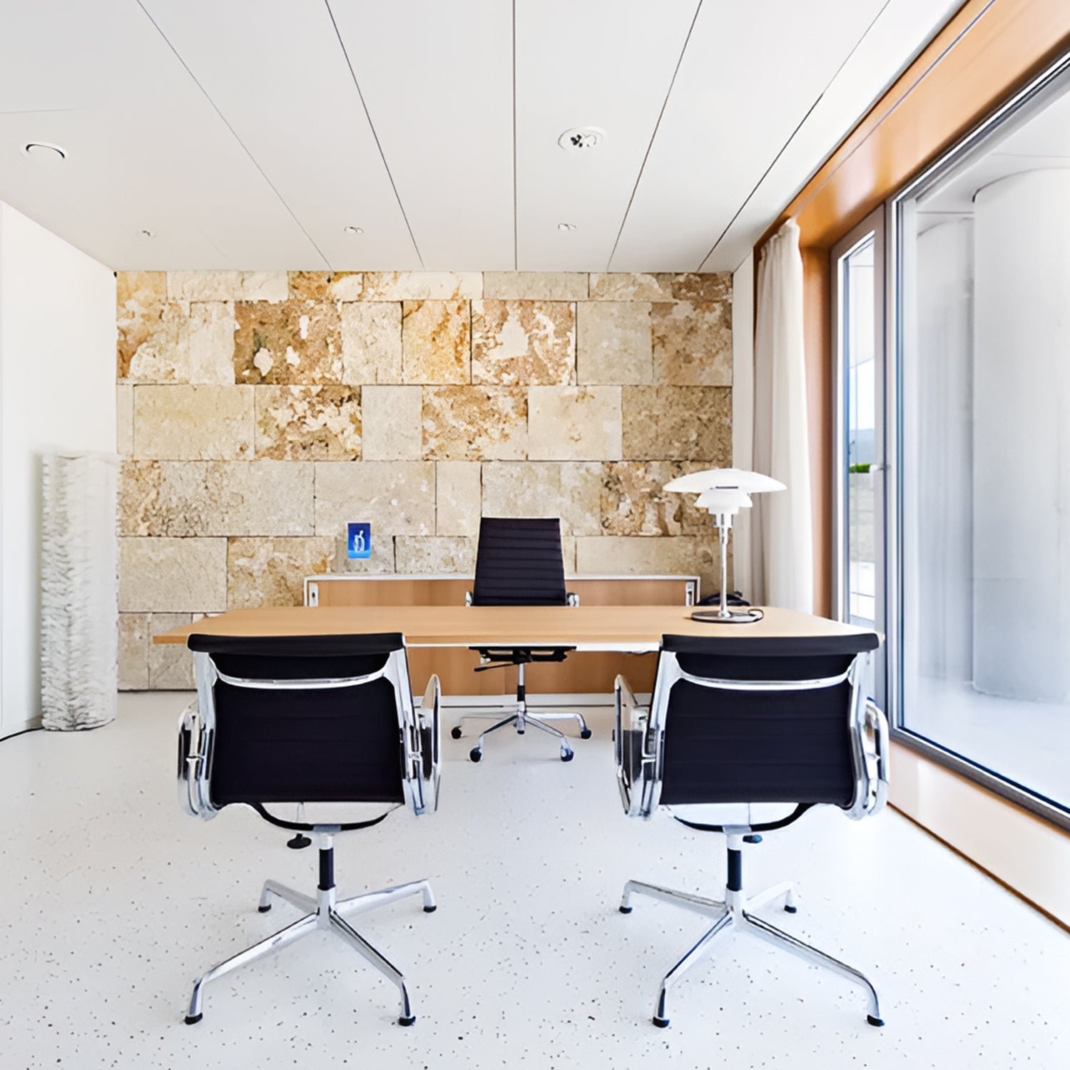 The fixture is designed based on the principle of a reflective three-shade system, primarily directing the light downwards. The shades are made of hand-blown opal three-layer glass, with a glossy surface on top and a sandblasted matte finish on the underside, providing soft and even light distribution.