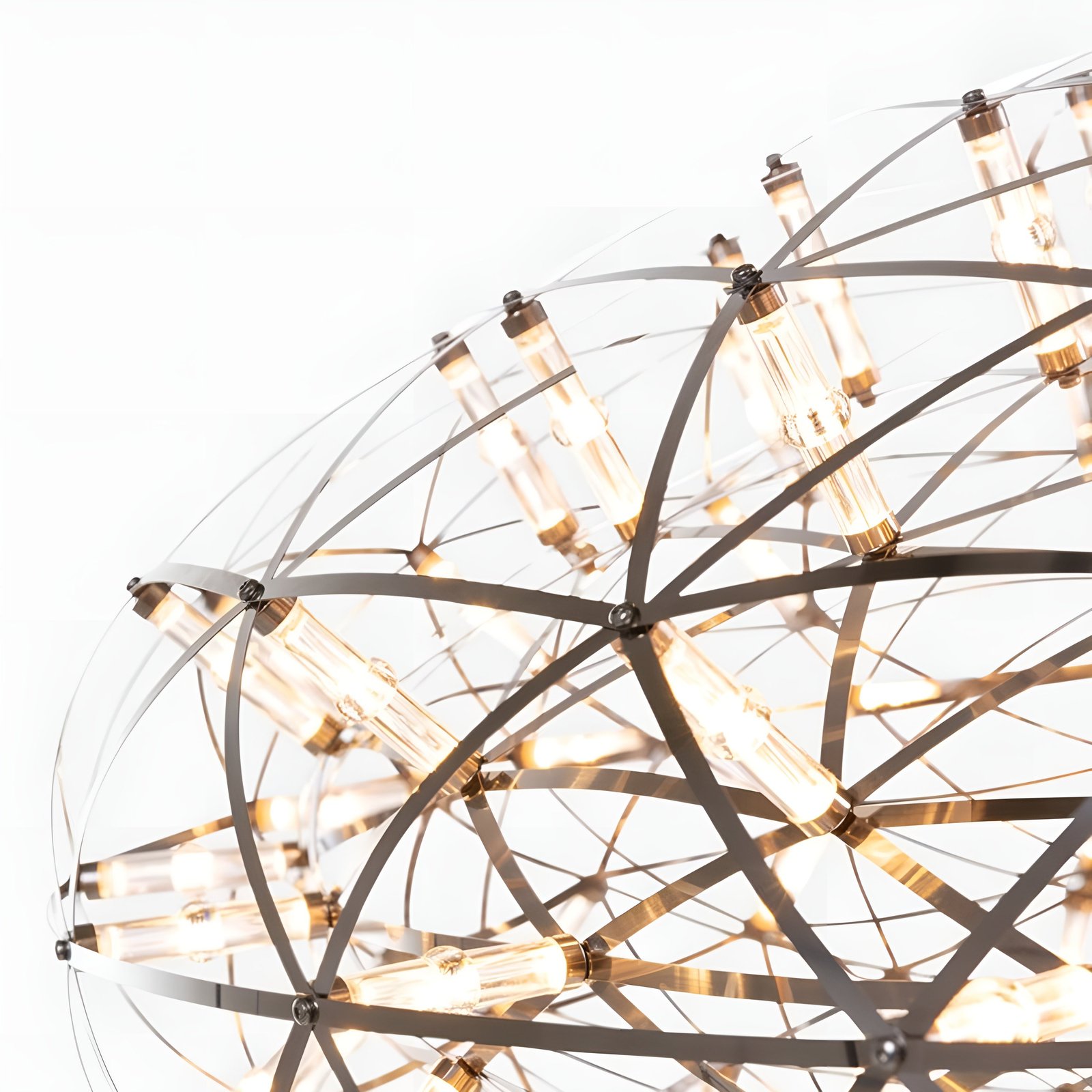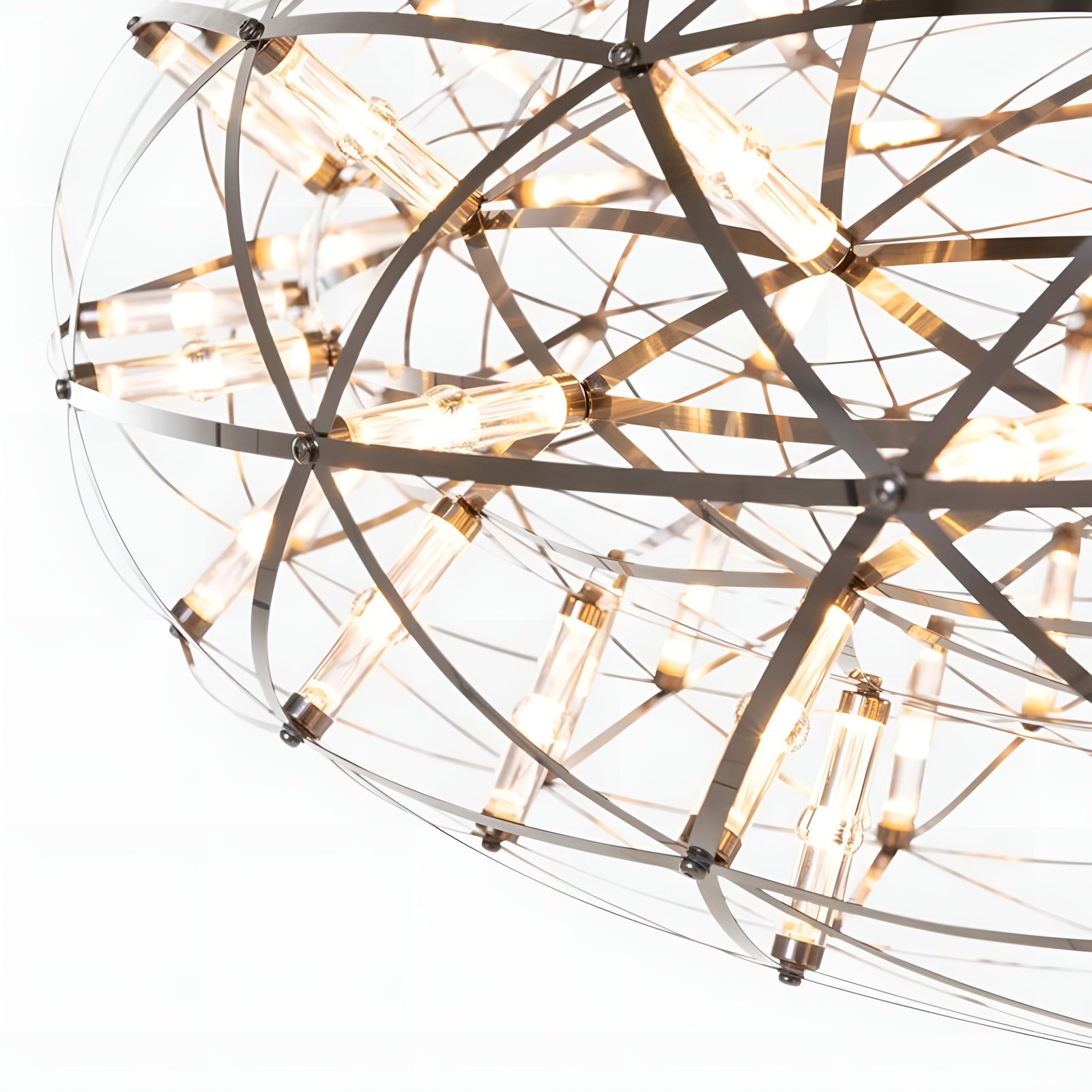 The oval shape of the Raimond Zafu and its tiny LED lights create an extraterrestrial effect. Like the spherical series, the Raimond Zafu is also made with the same elegant metal strips and mathematical materials. The name “Zafu” is inspired by the transcendent shape of a meditation cushion.