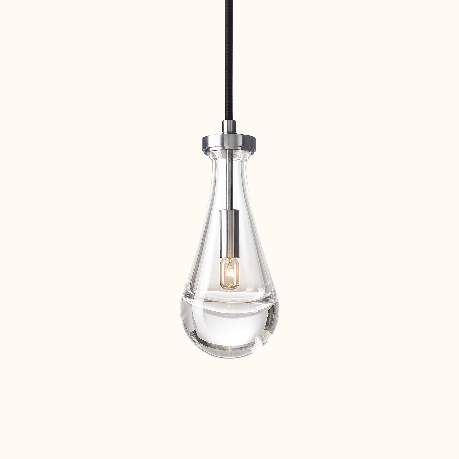 A master glass designer has created a dramatic interpretation of rain in this inspired collection. Suspended from a slim frame, a single drop of blown glass encases the bulb, emitting a soft glow.