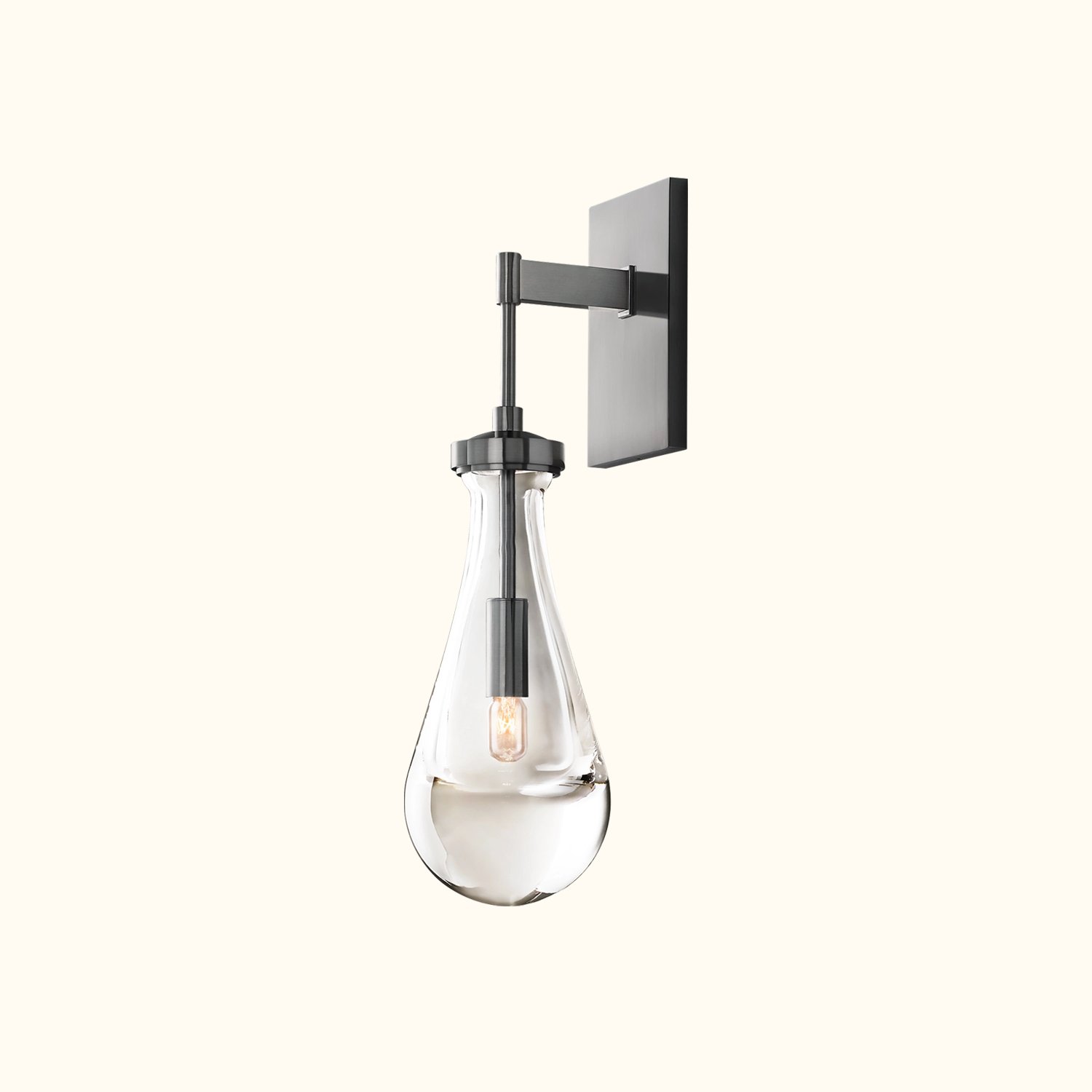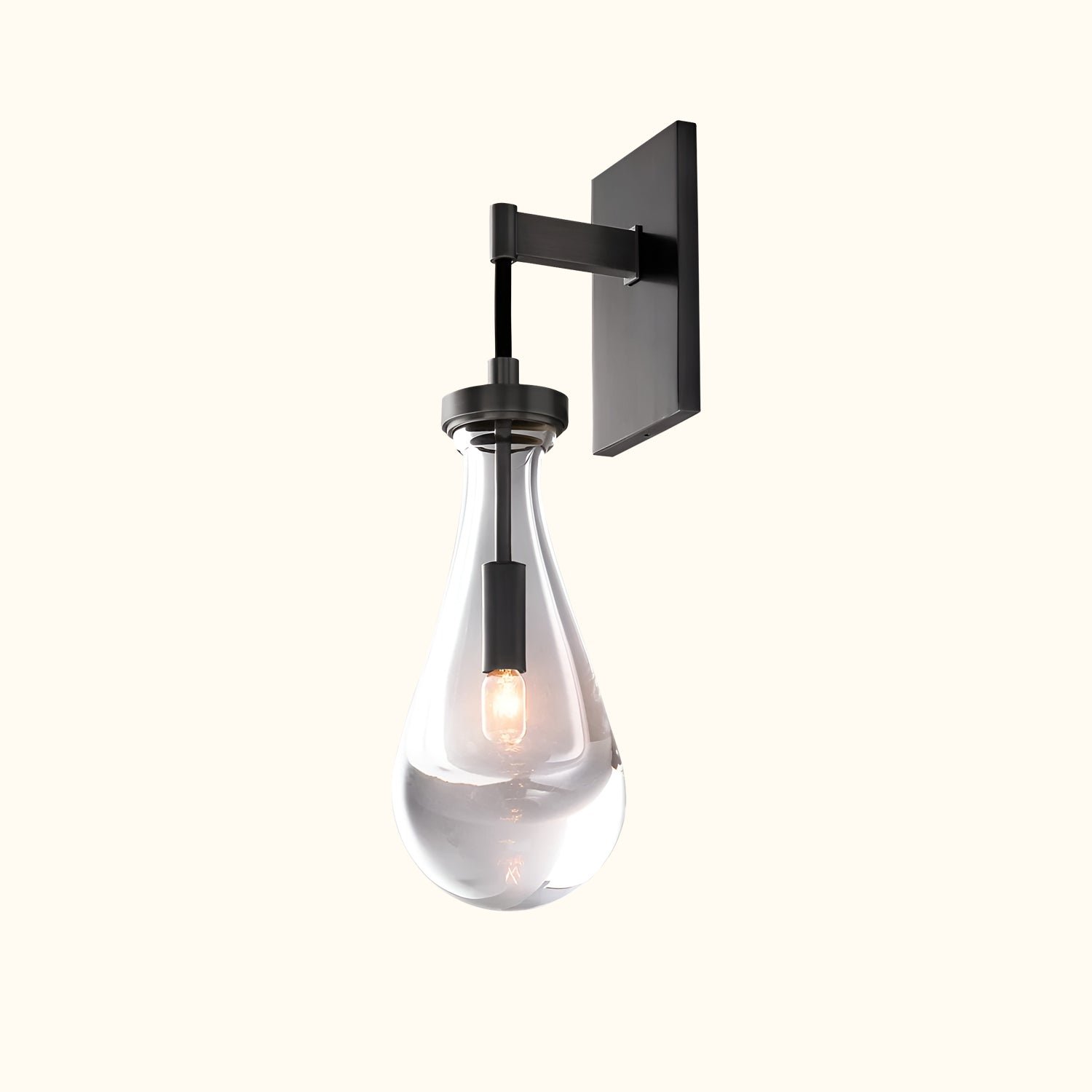 A master glass designer has created a dramatic evocation of rain in this inspired collection. Suspended from a slim frame, a single drop of blown glass encases the bulb, casting a luminous glow.
