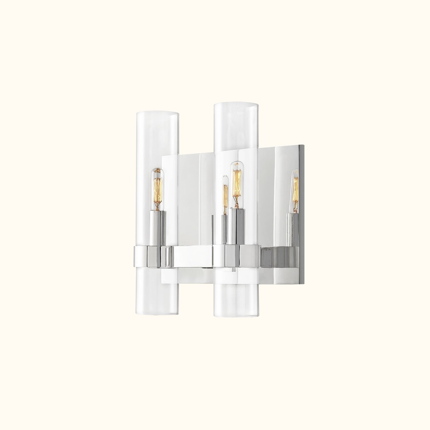 This collection reinterprets Art Deco forms with a modern minimalist sensibility. Crafted from solid steel, sleek metal bands securely hold slender glass cylinders, presenting a perfect sense of balance. Within each cylinder, Edison bulbs flicker like dancing candlelight.