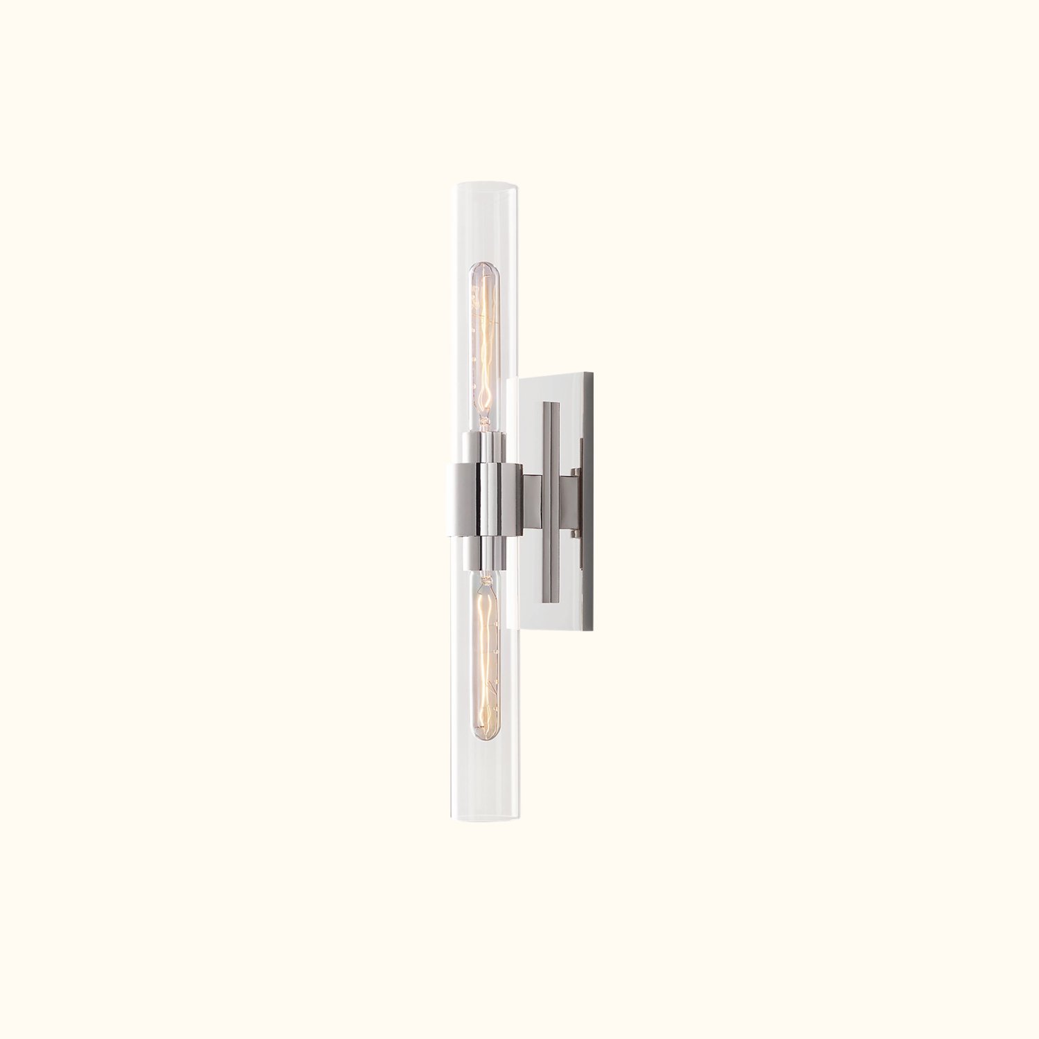 This collection of fixtures by a renowned lighting designer reinterprets the Art Deco style with a modern minimalist sensibility. The fixtures are crafted from solid steel, with unadorned metal bands securing slender glass cylinders in place, maintaining a perfect sense of balance. Each fixture features Edison bulbs that flicker like glowing candles.