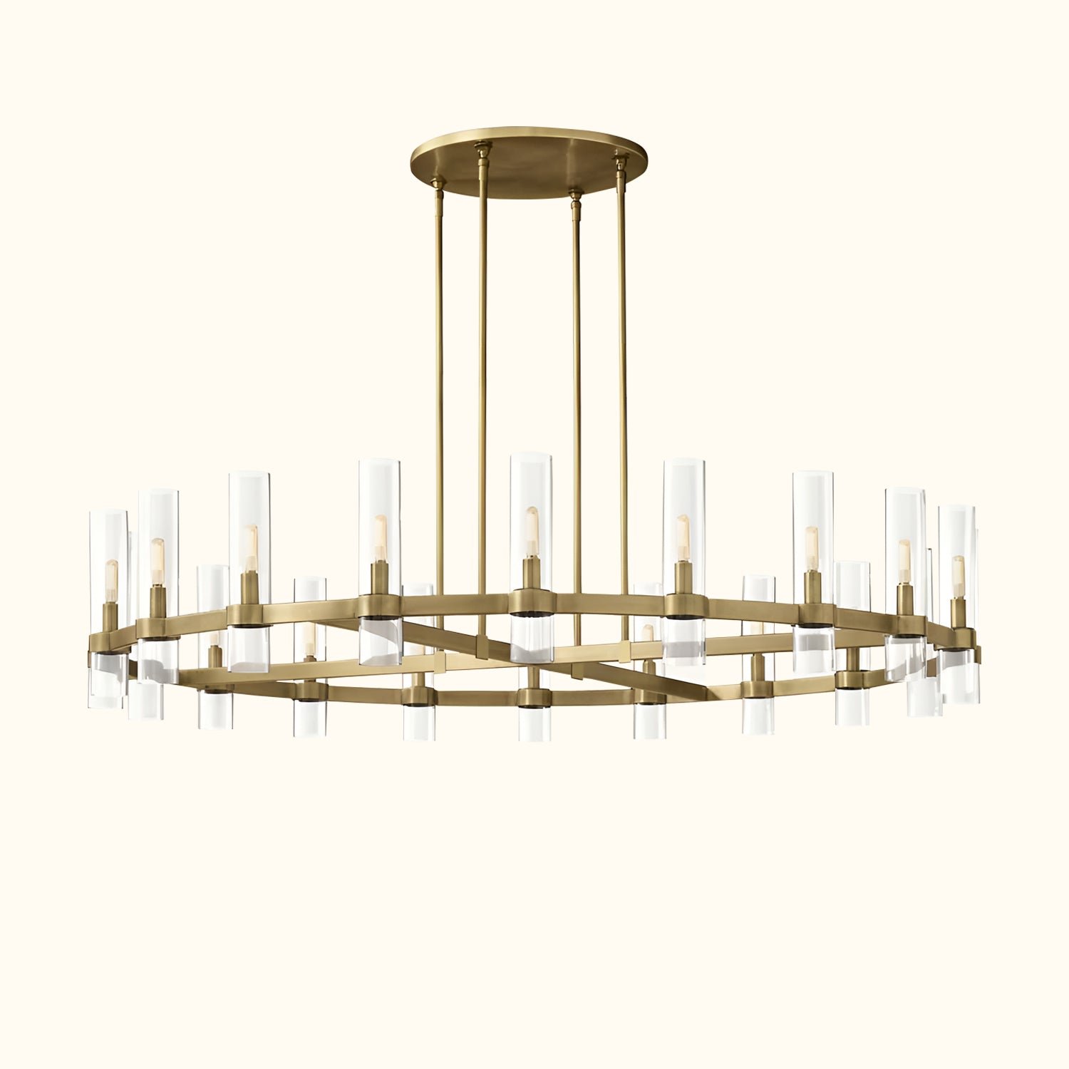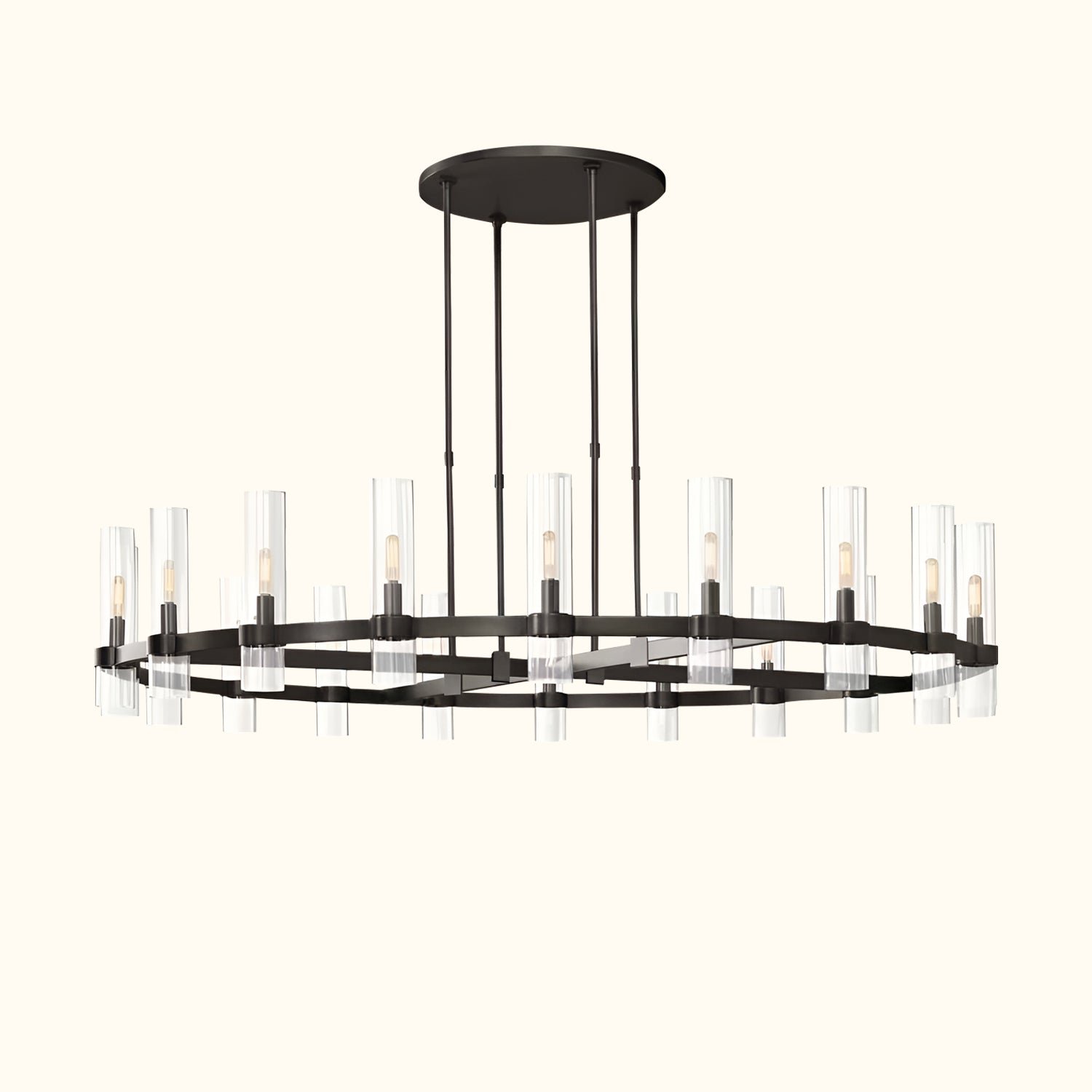 A renowned lighting designer reimagines Art Deco forms with a modern minimalist sensibility in this collection. Crafted from solid steel, unadorned metal bands securely hold the slender glass cylinders in place, maintaining perfect balance. Inside each shade, Edison bulbs glow like flickering candles.