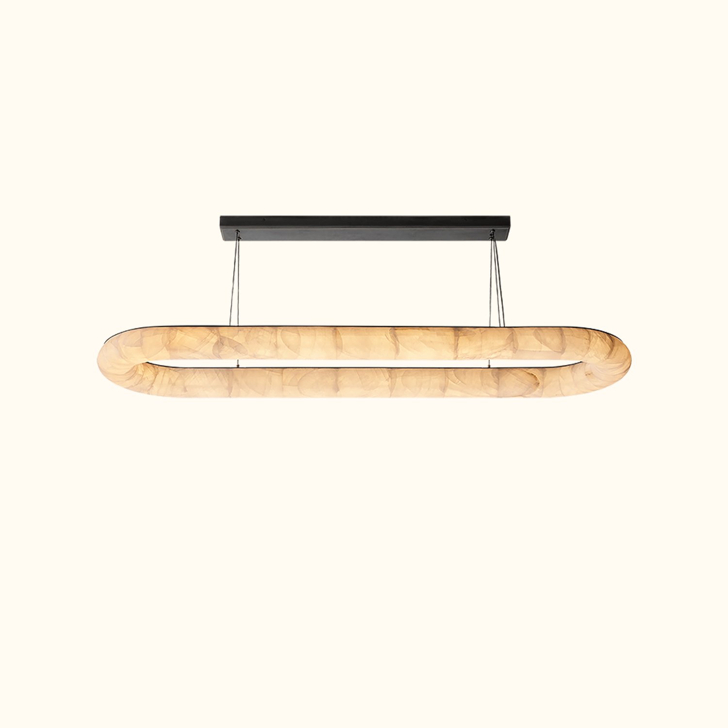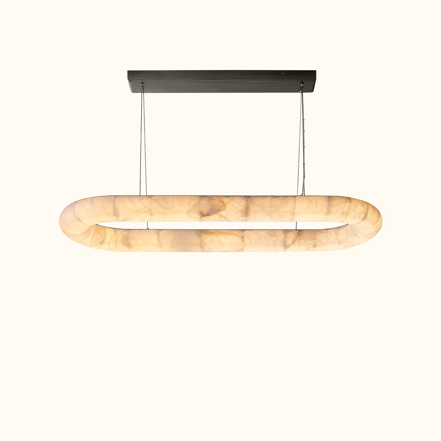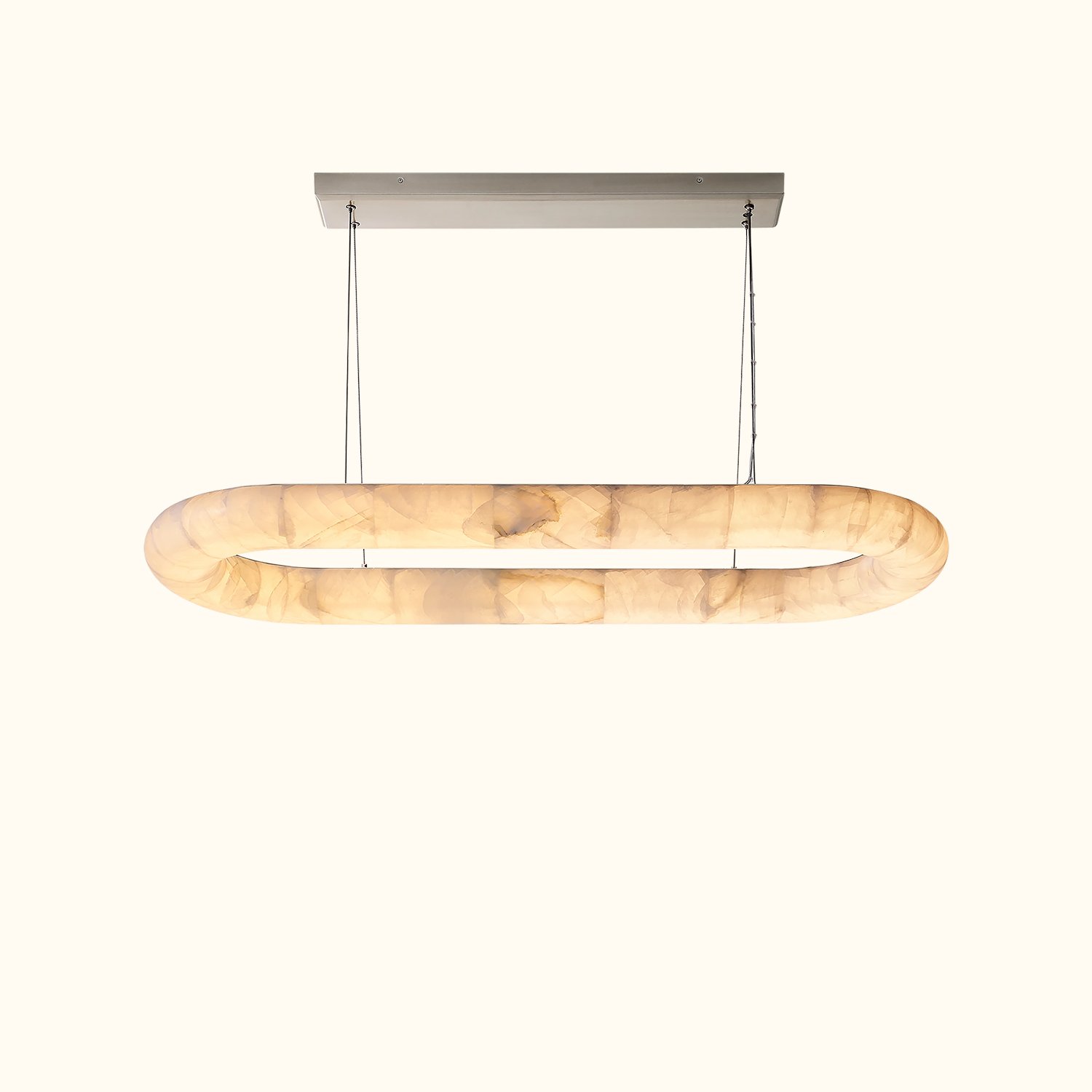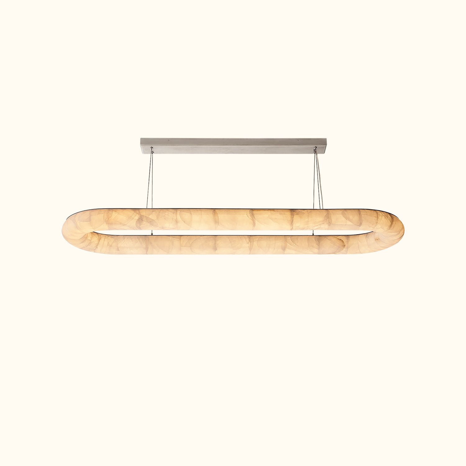 Our Rivage Lisse chandelier features an ultra-minimalist design with a striking effect, celebrating the beauty of calcite, a translucent stone that emits a warm, natural glow. The polished stone ring hangs from slender steel cables and is meticulously assembled to create a smooth, continuous surface, while the subtle internal lighting highlights the organic colors and textures. Each fixture is a unique statement.