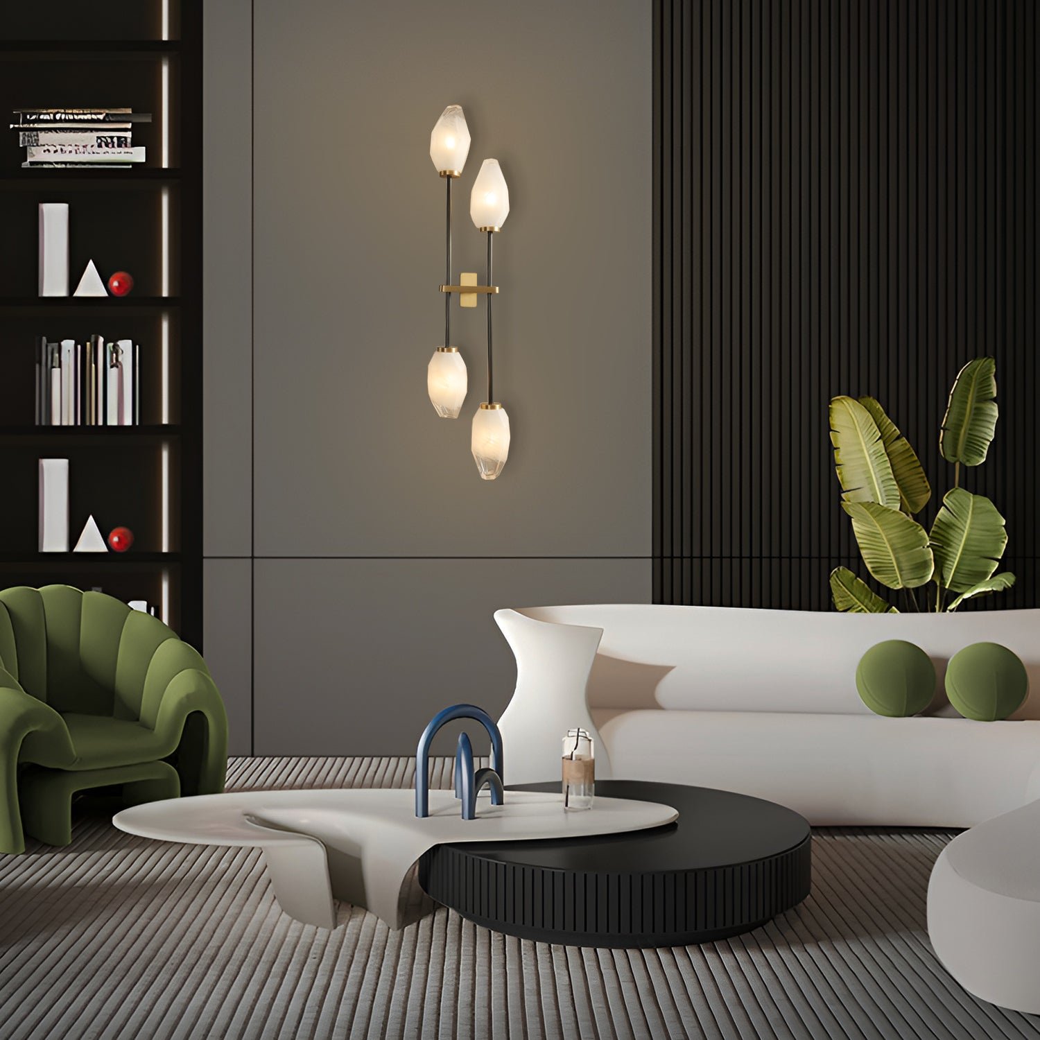 Showcasing the natural beauty of raw rock quartz within LED-lit artisan blown glass, these wall sconces embody a contemporary elegance inspired by organic forms, complemented by our hand-polished Belvedere metalwork.