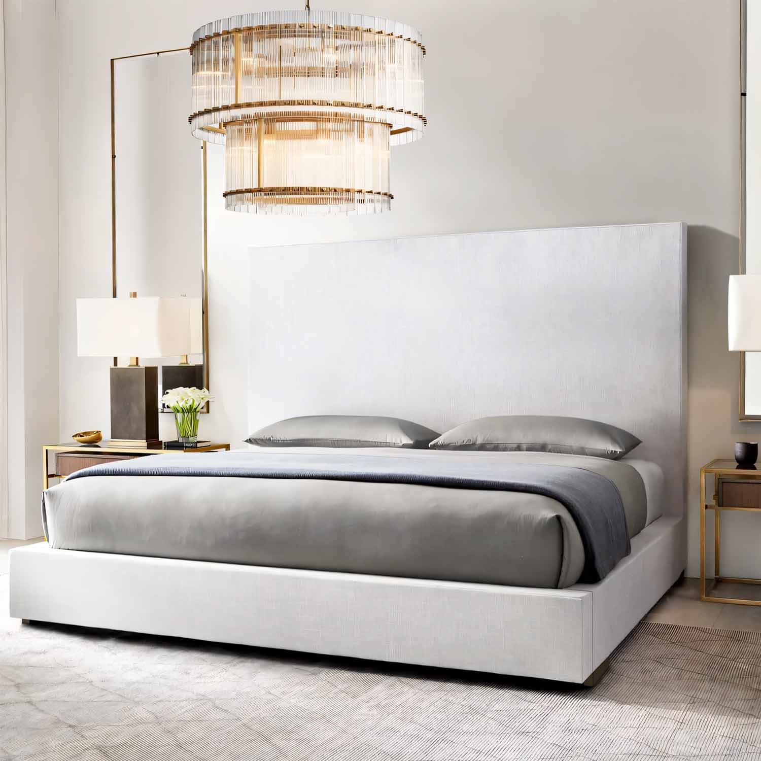 Our fixture, designed by a renowned designer, evokes the glamour of 1960s Italian glass lighting. Dozens of glass panes are arranged within a sleek metal frame, hand-raked to create a fluted texture that produces a dramatic play of light and emits a softly diffused glow.