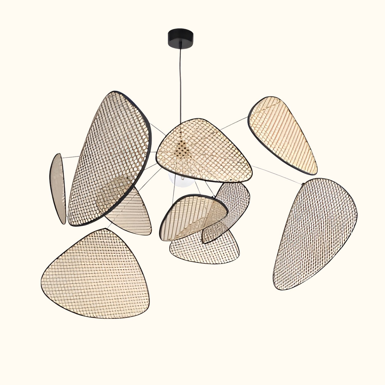 The XL pendant light embodies a sense of movement. It features a painted metal structure with 10 cane screens and fabric trim. It is equipped with a textile cord and a versatile DCL metal bell.
