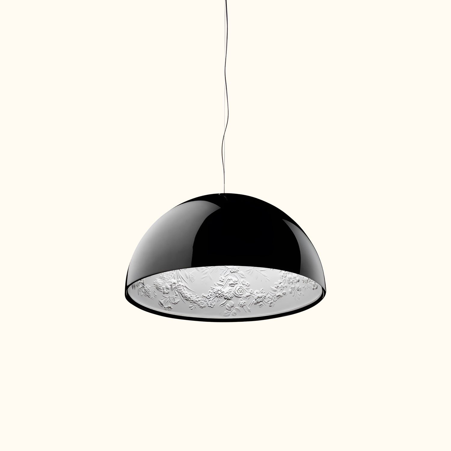 Suspension luminaire providing diffused lighting. Hemispherical, mechanically processed cast plaster diffuser, painted white inside. Outer finishes available in rust, glossy black, glossy white, or matte gold. The plaster diffuser support is made of die-cast aluminum alloy, with a liquid-painted white finish. The upper bushing is made of die-cast polished aluminum alloy, protected with transparent paint on all visible parts. The upper cable gland and locking ring nut are made of black injection-molded PC (polycarbonate). Molded galvanized adjustment screws. Transparent, injection-molded upper and lower silicone shock absorbers. The lamp holder and fixing support are made of black injection-molded PPS (polyphenylene sulfide). The diffuser is flashed and blown opal glass. The molded fixing ring nut is made of die-cast aluminum alloy with Alodine plating. The Skygarden 1 frieze is made of photo-etched and mechanically drawn AISI 304 stainless steel. The ceiling attachment is molded and galvanized steel, with a gray injection-molded PA6 (Nylon) rose.