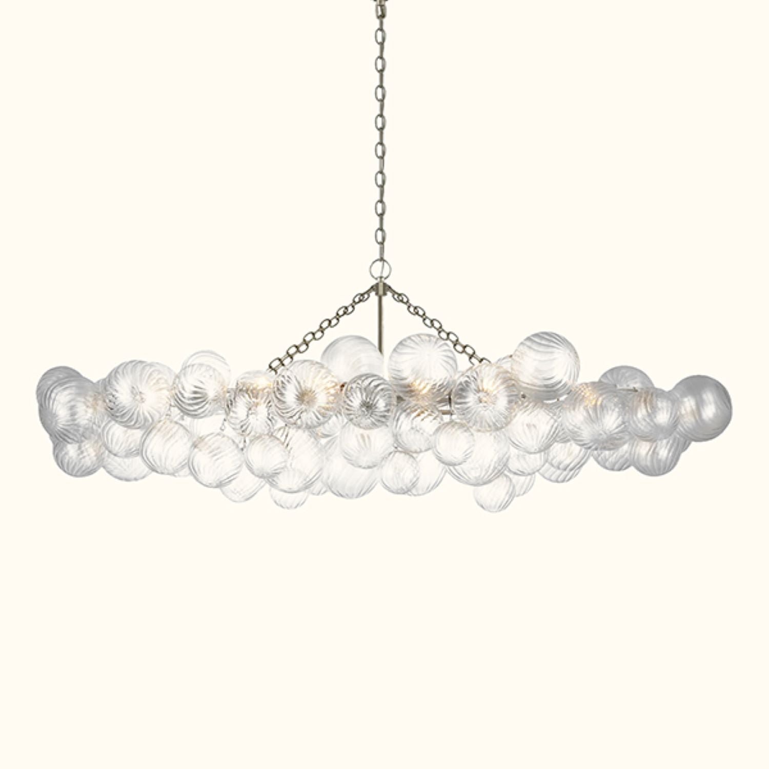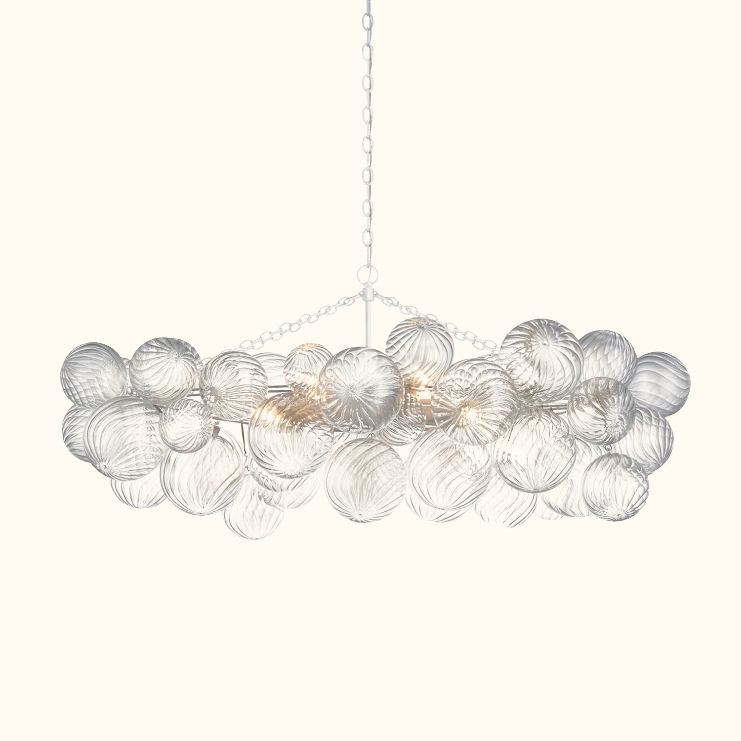 Handcrafted glass elevates the Talia series, bringing a fresh twist to the simple glass globe light fixture. Light sparkles through multiple swirling glass orbs attached to metal baskets, creating a whimsical atmosphere. The Talia series offers a variety of sizes and configurations, adding a dynamic mix of sparkling glass, rounded shapes, and bright metals to any interior decor.Choose a chandelier for entryways and dining areas, a flush-mount, or a wall sconce for living spaces or bedrooms, adding a playful, feminine touch to any space.