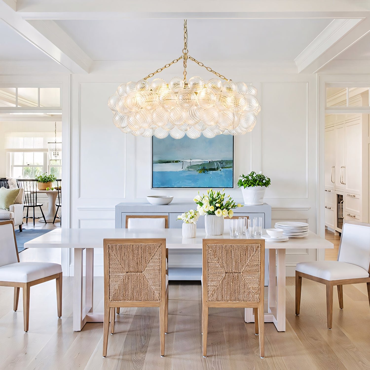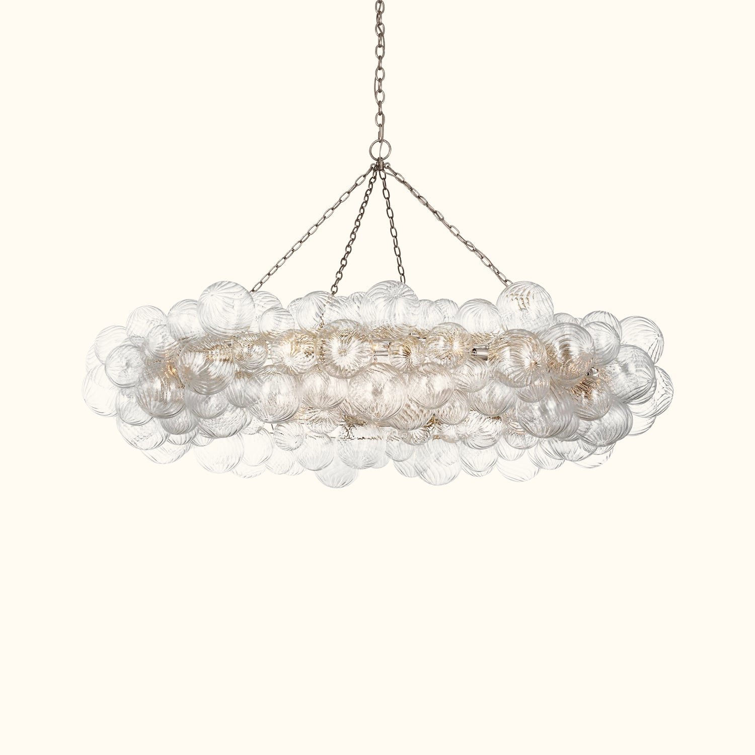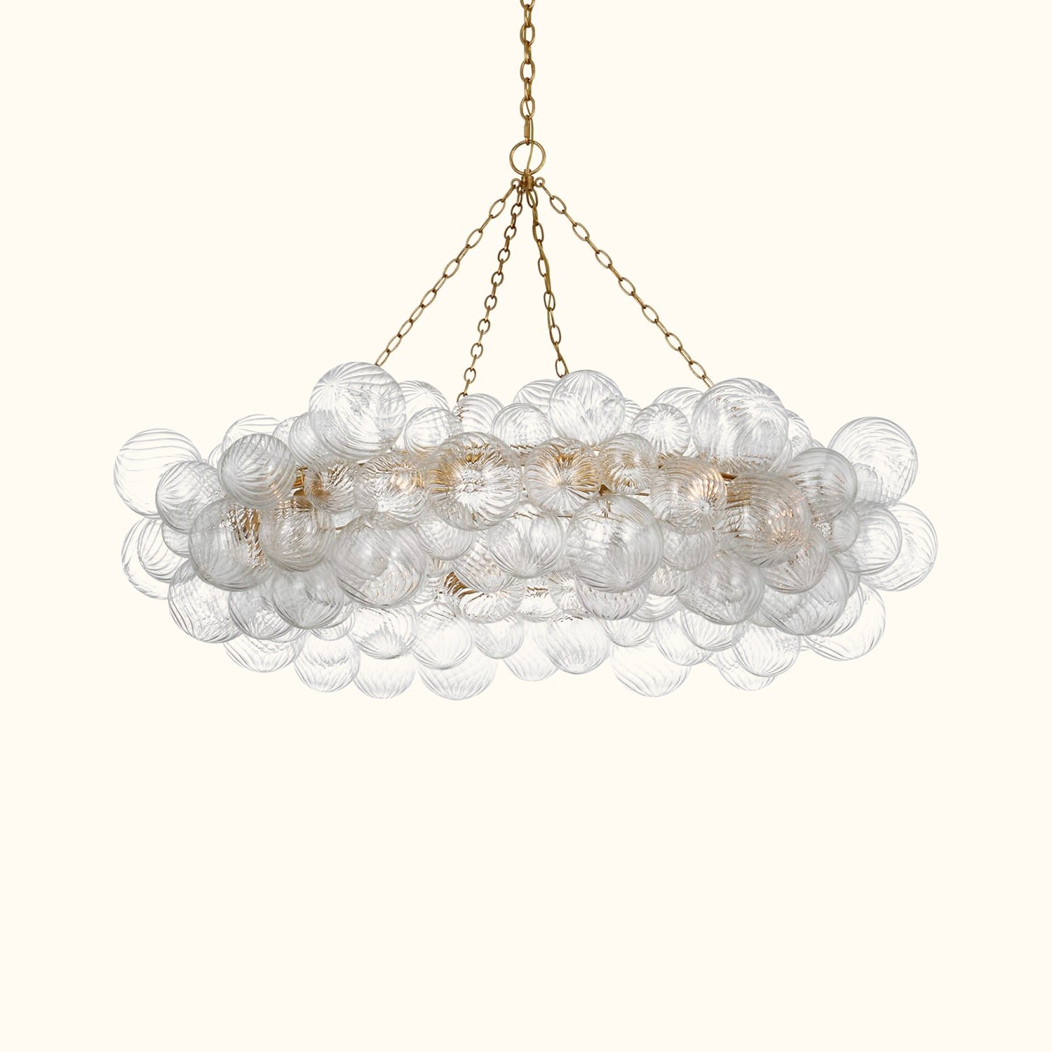 Handcrafted glass elevates the Talia series, giving new life to simple glass globe fixtures. Light flickers through multiple swirling glass orbs fixed in a metal basket, creating a whimsical atmosphere. The series offers various sizes and configurations, adding a dynamic combination of sparkling glass, round shapes, and bright metal to any indoor space. Choose pendants for entryways and dining areas, and select recessed or wall sconces for living spaces or bedrooms, bringing a playful and feminine touch to any environment.