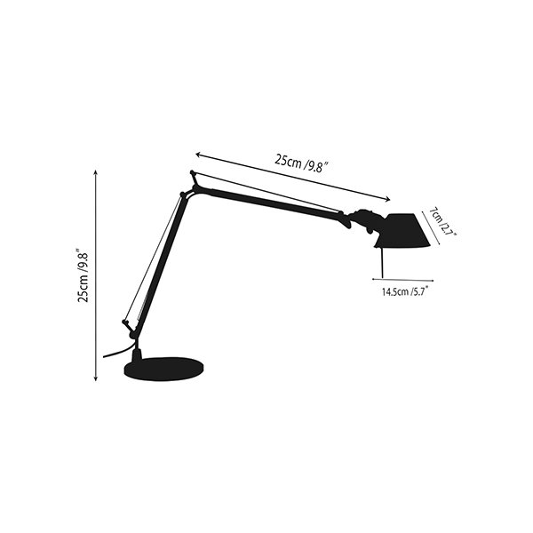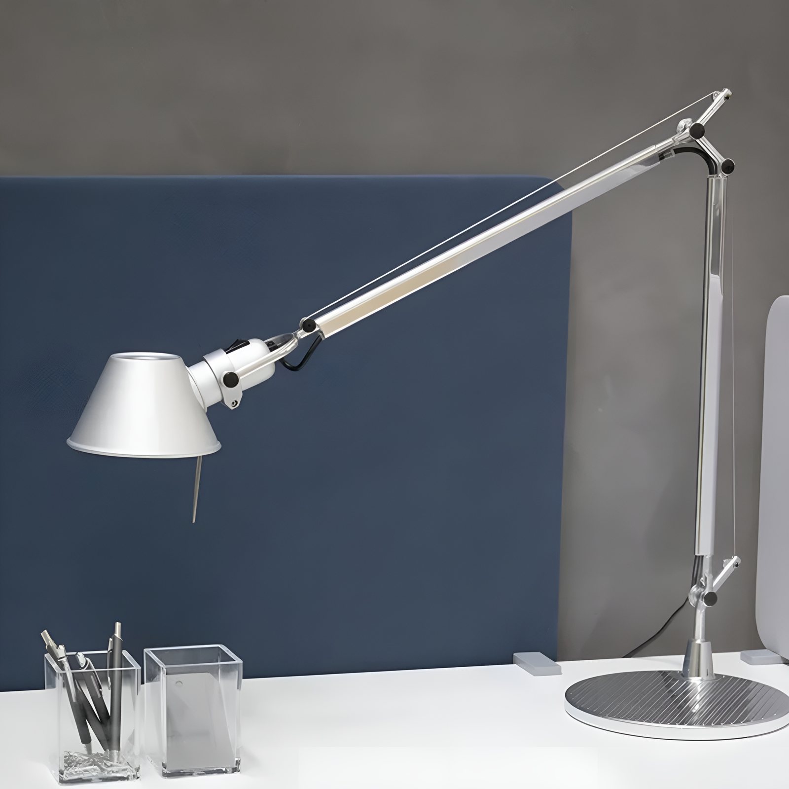 Tolomeo Mini is a table lamp designed by two designers. The base and cantilevered arms are made of polished aluminum; the diffuser is made of matte anodized aluminum; the joints and supports are also made of polished aluminum. It features a spring balancing system.