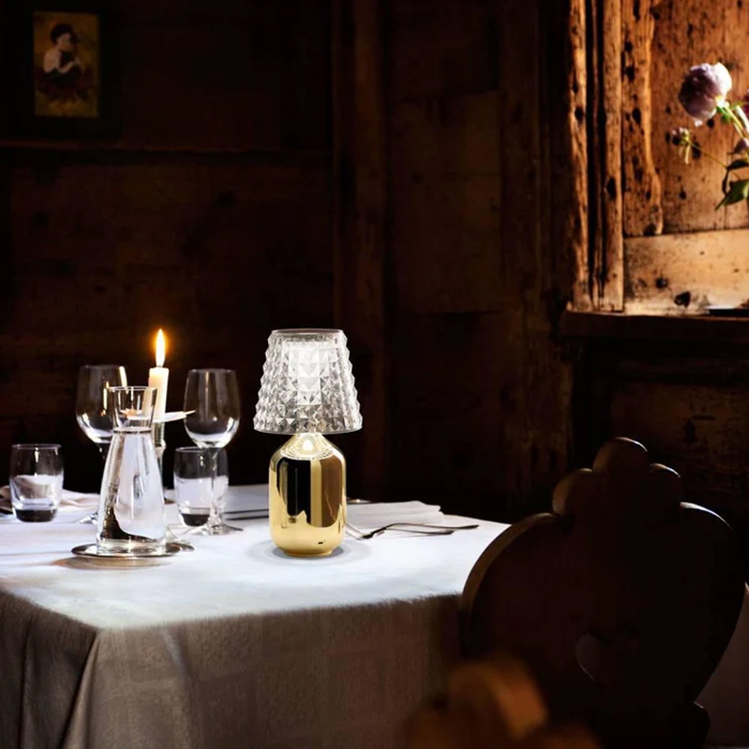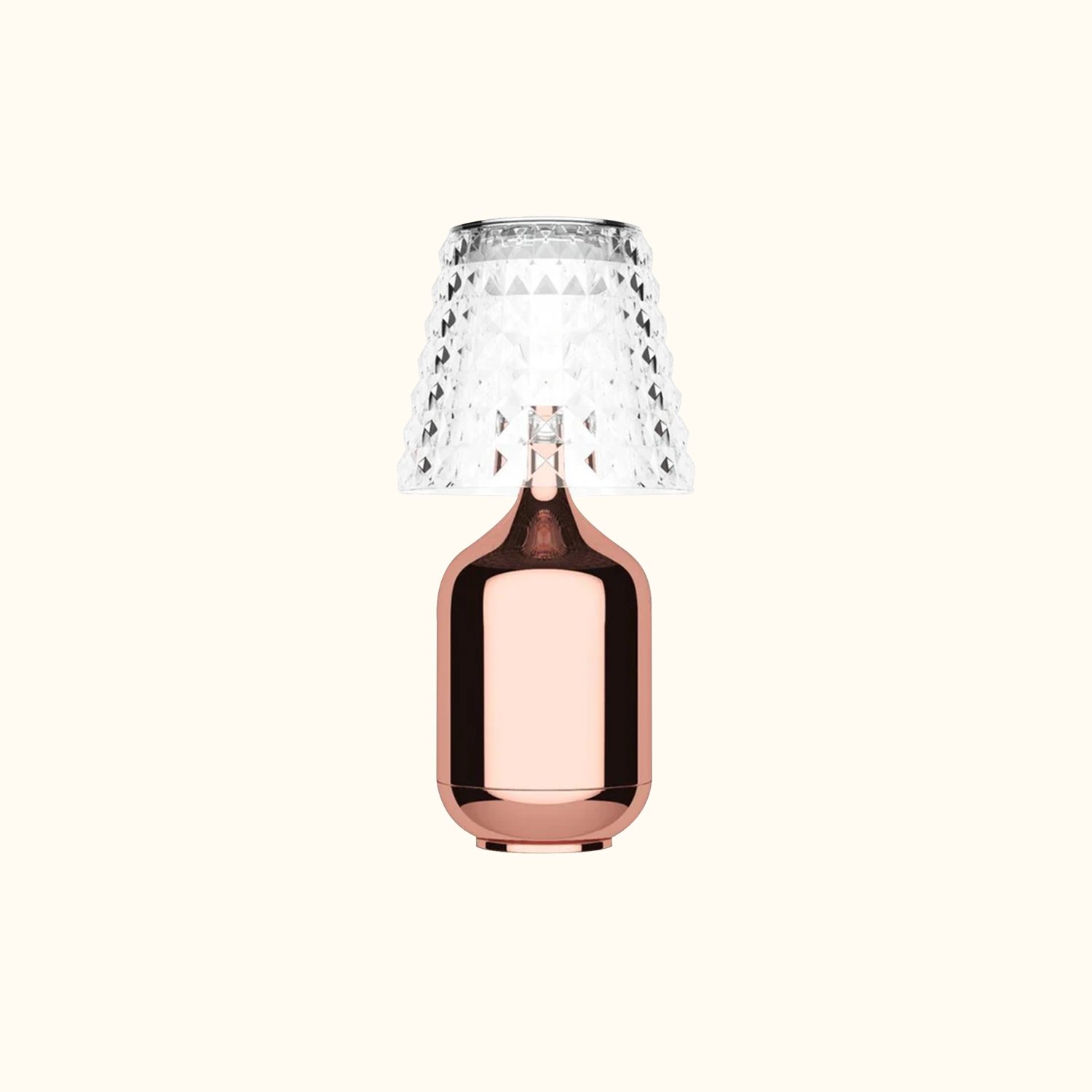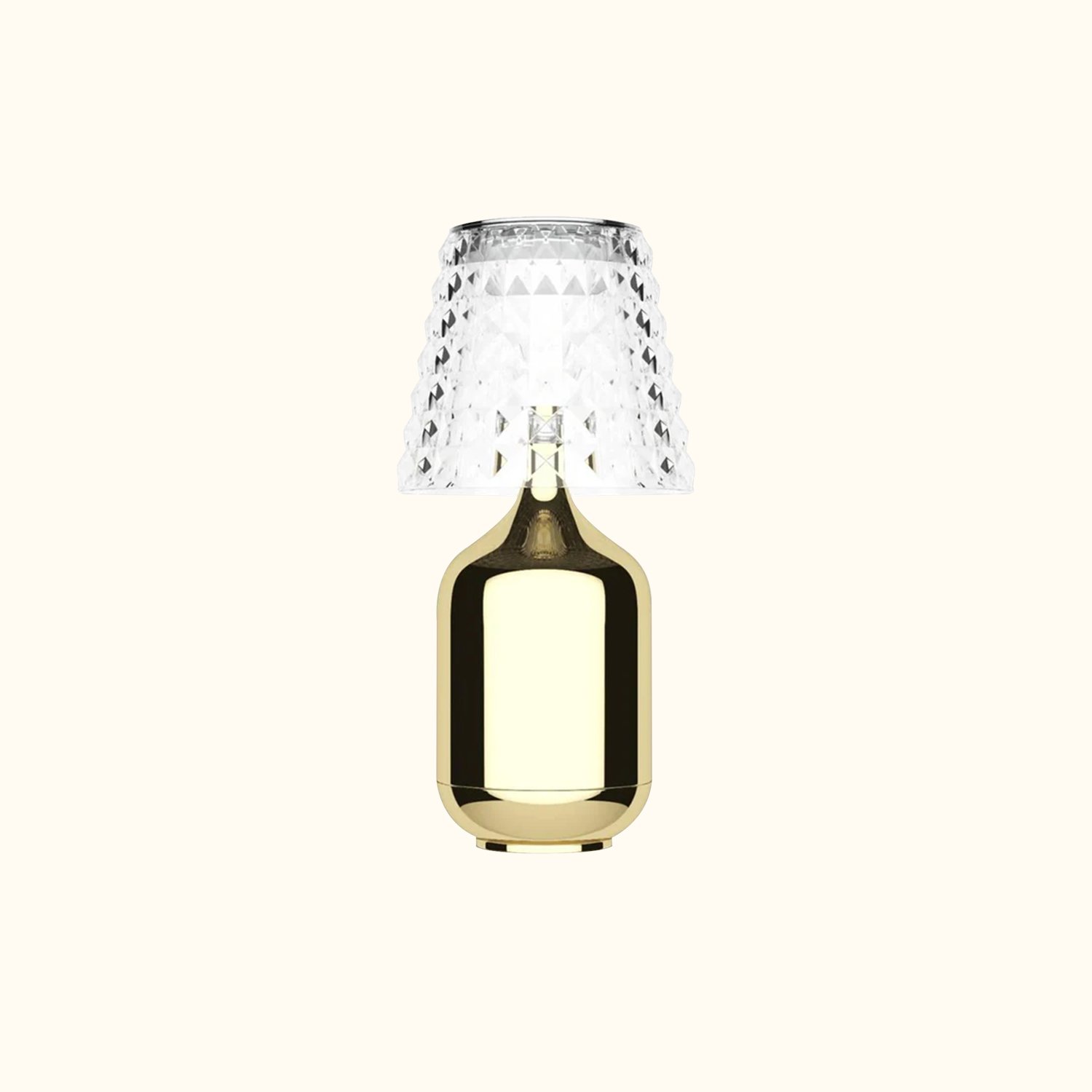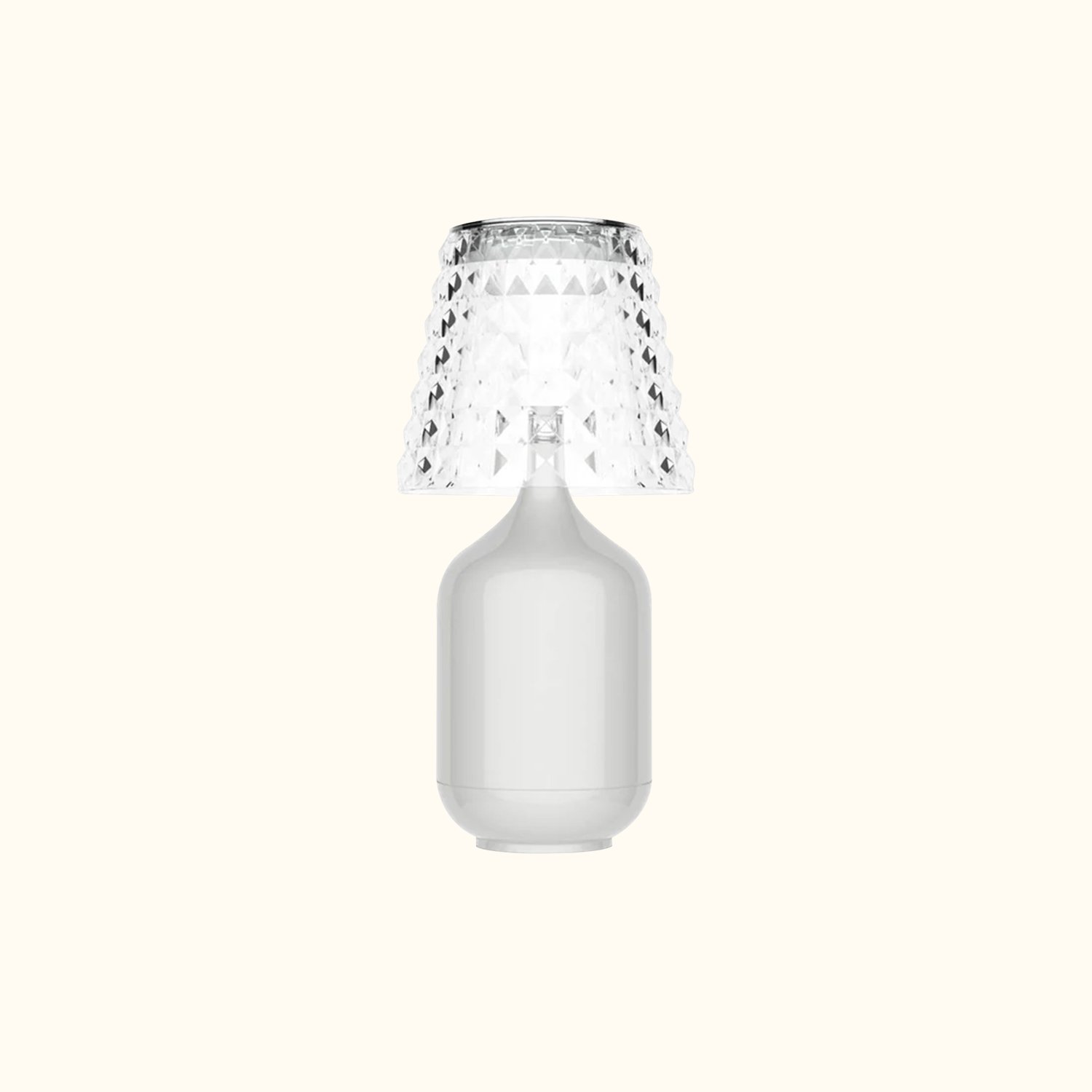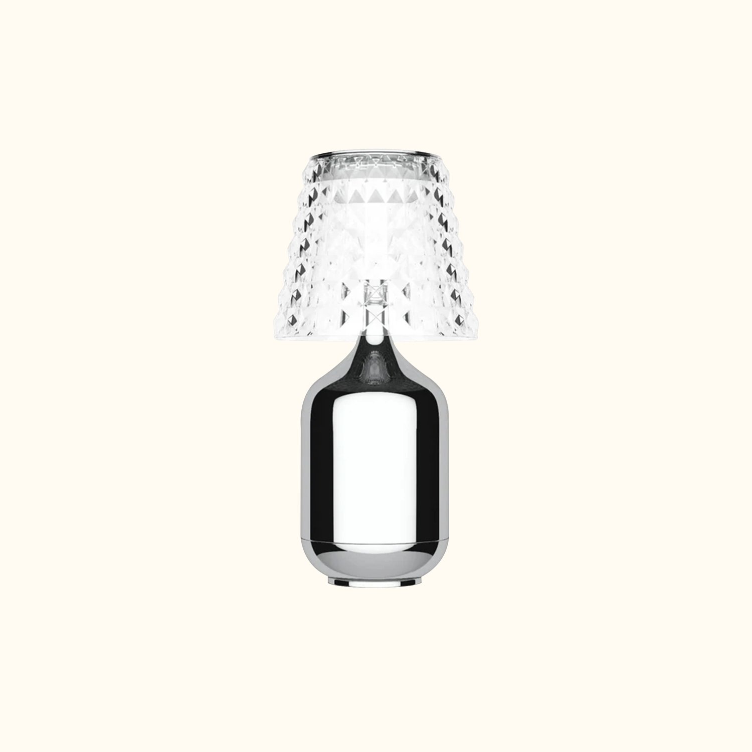 The cordless table lamp, inspired by high fashion, produces enchanting light reflections that create wonderful visual illusions in your space. It features a faceted acrylic shade and is available in finishes of Chrome, Black, Gold, or White. A rechargeable battery is included, and it is suitable for outdoor use. It is rated for damp locations and complies with CE and ETL standards.