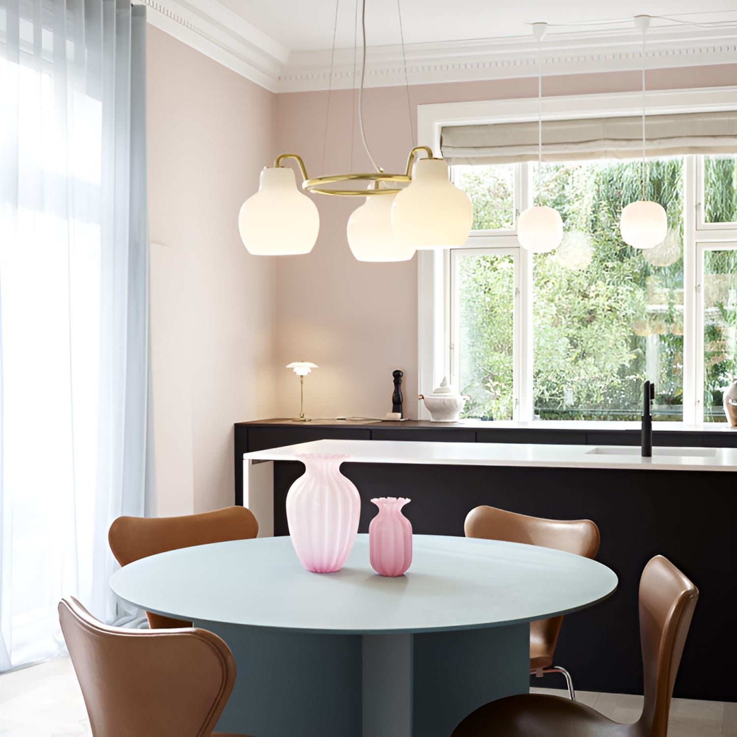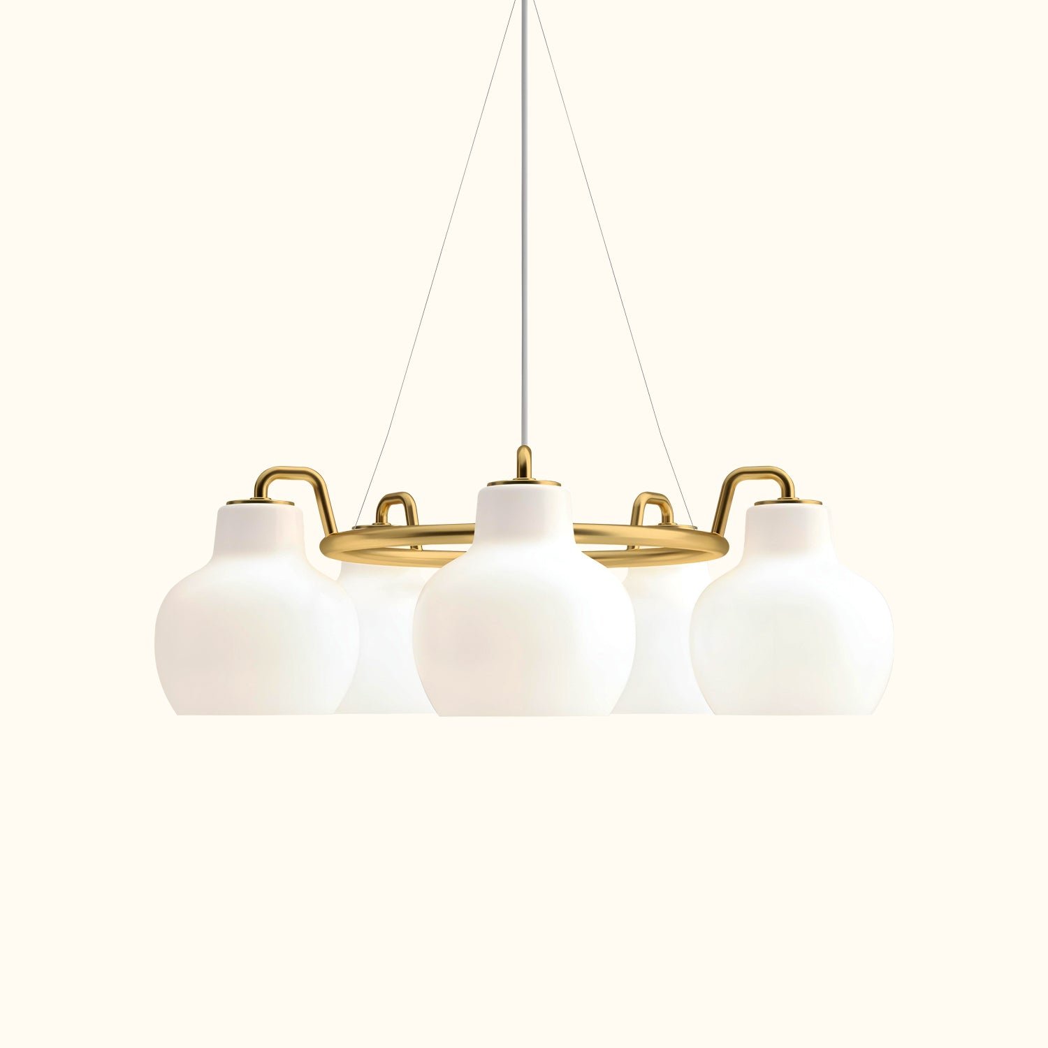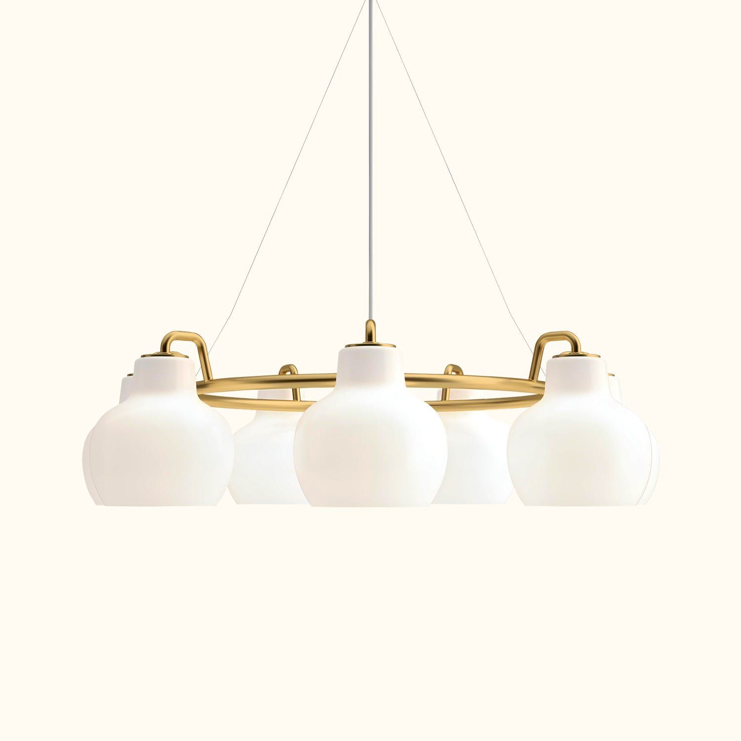 The VL Ring Crown series originates from a lamp designed by architect Vilhelm Lauritzen in the 1940s for the Danish Broadcasting Corporation (located in Copenhagen). This series of wall lamps and pendant lamps features a distinctive organic design that made the Danish Broadcasting Corporation stand out. Vilhelm Lauritzen also designed the VL38 and VL45 lamps for the building. Although the original version of the VL Ring Crown lamp was not used in the building, the brand soon produced and launched the Ring Crown lamp based on the original drawings. In 1947, Finn Juhl, a designer under Vilhelm Lauritzen, used the VL Ring Crown lamp in an interior design project for the Danish porcelain manufacturer Bing & Grøndahl in Copenhagen. In 2019, the VL Ring Crown lamp was reintroduced, staying true to the original materials and design. This lamp is made of untreated polished brass and is available in models with three, five, or seven shades, crafted from glossy, hand-blown, triple-layered white opal glass. Alongside this lamp, the original wall and pendant lamps that were installed in the Danish Broadcasting Corporation were also reintroduced. The VL Ring Crown lamp series adds a unique and authentic touch to stylish interiors, softly illuminating modern life with its warm light.