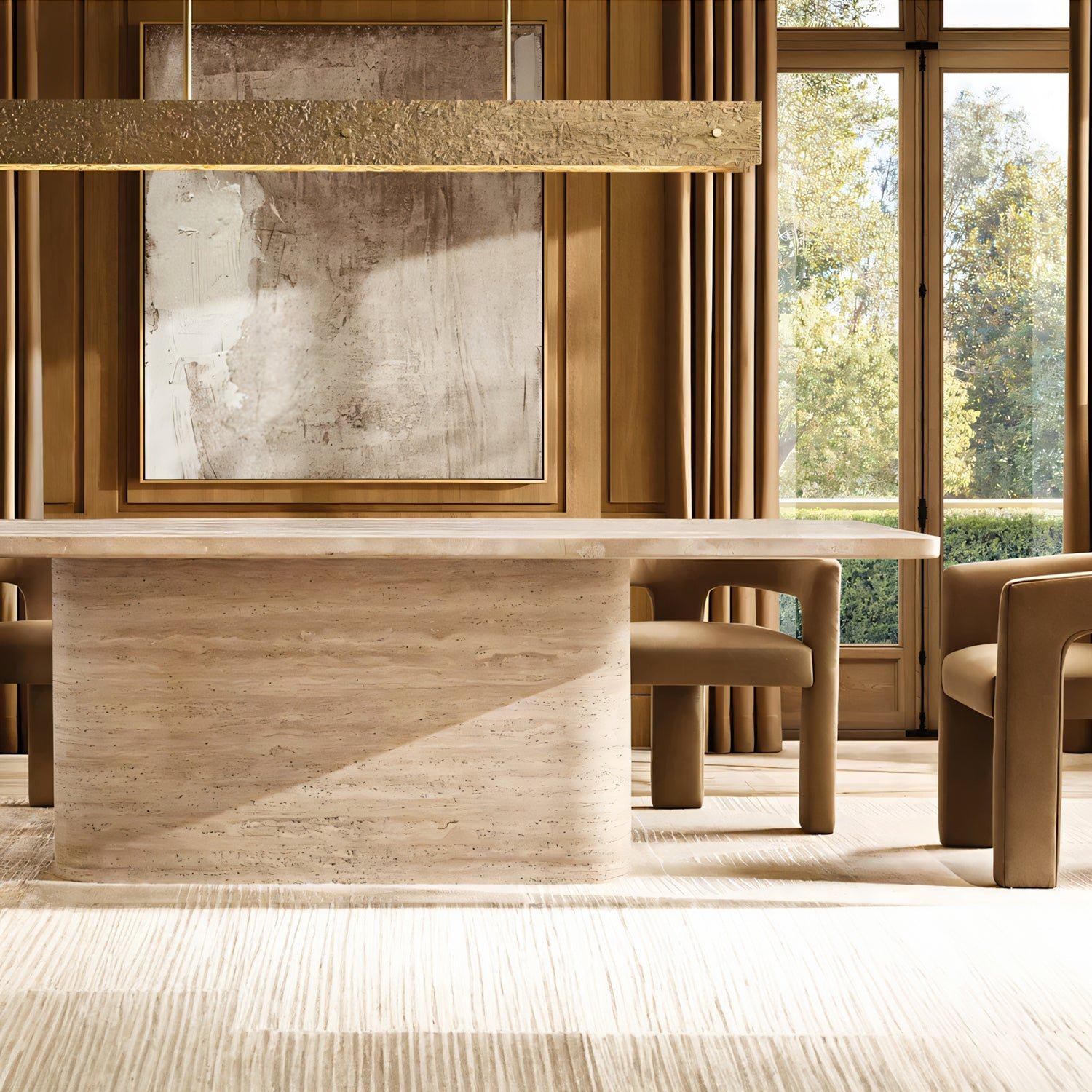 Solid brass is cast in hand-formed molds to achieve the complex, sensual textures that are the focus of the designer’s sculptural Vouvray collection. Minimalist geometric shapes are the perfect vehicle for tactile surfaces, reminiscent of the work of modern master. The light is moody and atmospheric.