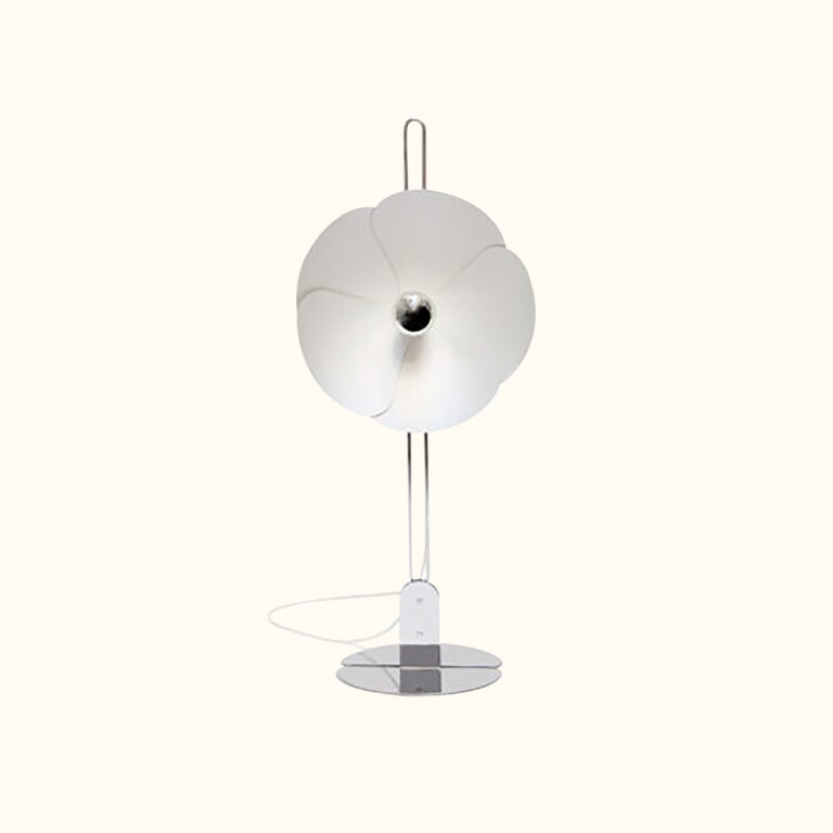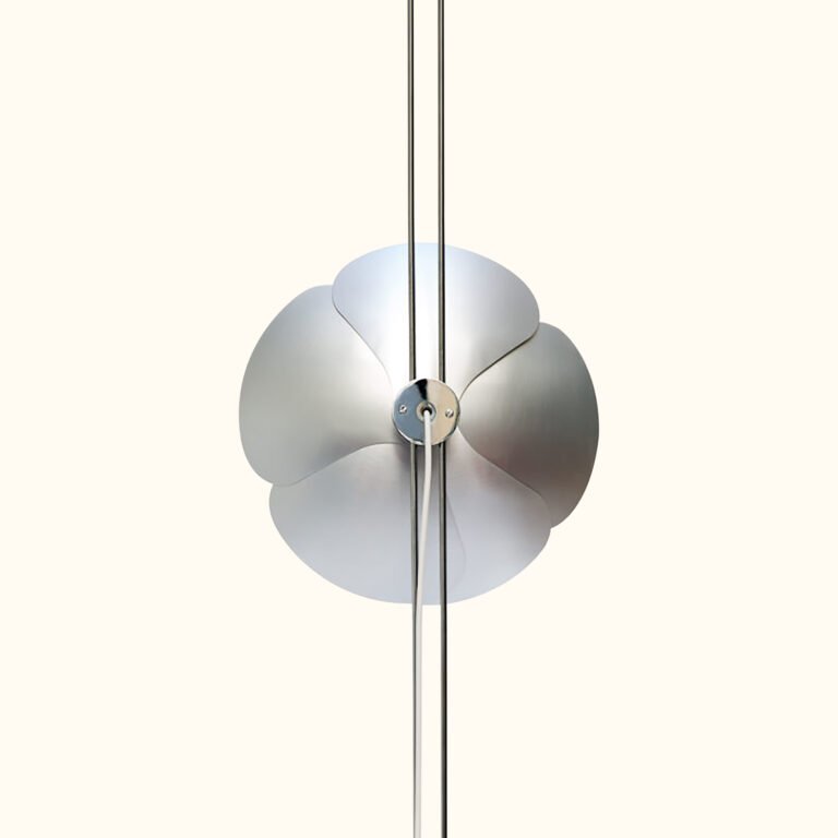 In 1967, a flower-shaped lighting fixture was invented, made of aluminum petals fixed onto two chrome-plated metal wires, designed for